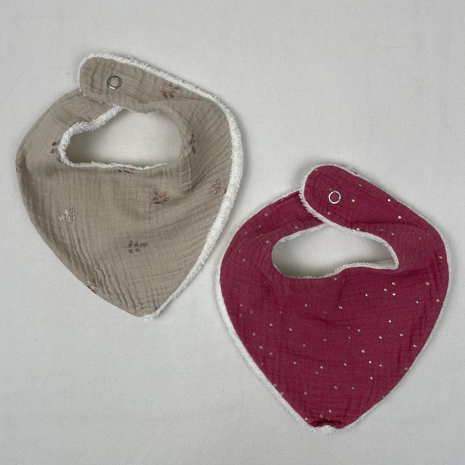 Autres commentaires : Lot de 2 bavoirs bandana, en gaze de coton : -1 rose à pois dorés ; -1 crème à motifs fleuris dorés. Fermeture par boutons pression.