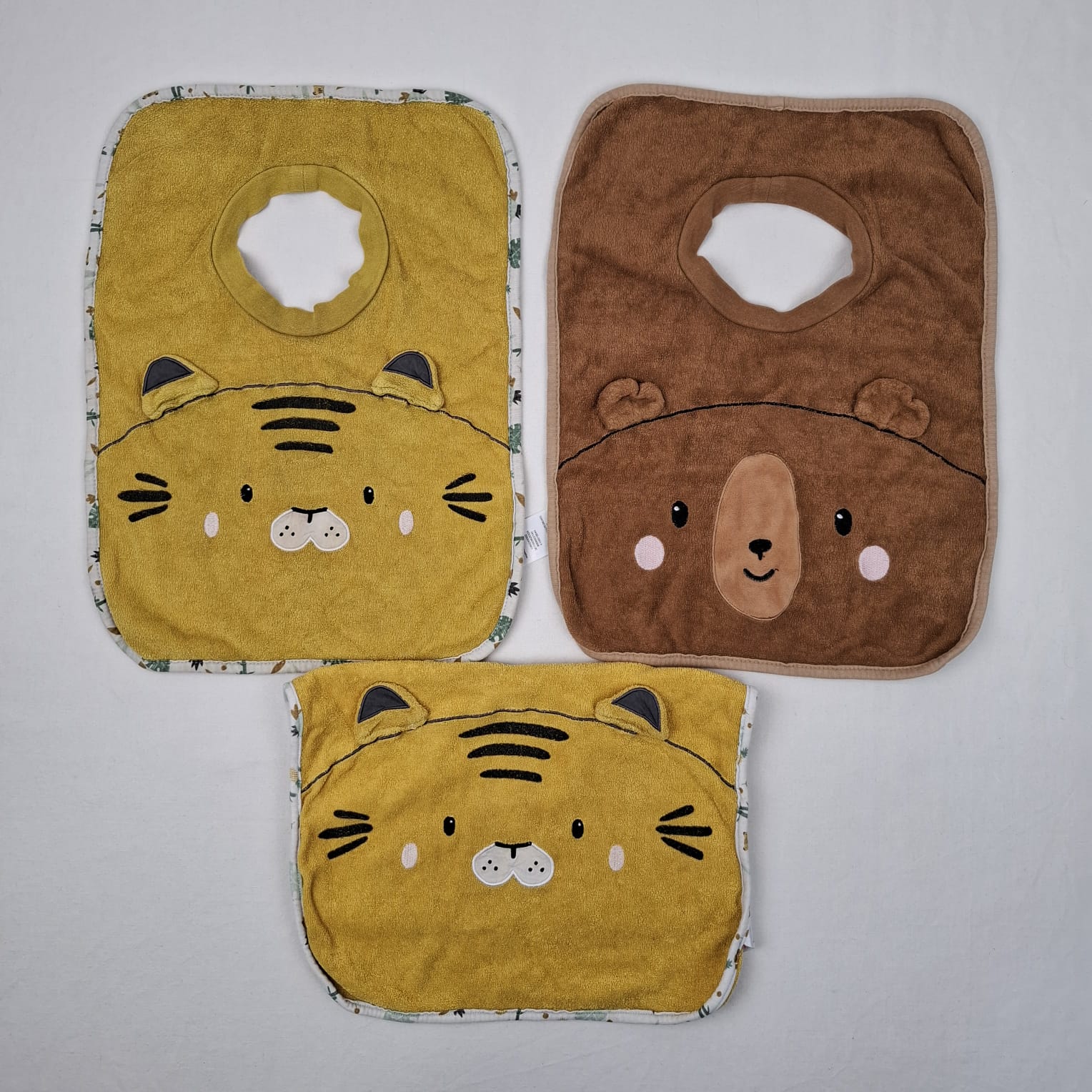 Autres commentaires : Lot de 3 grands bavoirs à enfiler vertbaudet 43 x 34 cm , Broderie et oreilles volantes ,Biais en jersey imprimé ,Devant et doublure éponge , 2 jaune motifs chat et 1 marron motif ours , 80% coton et 20% polyester.