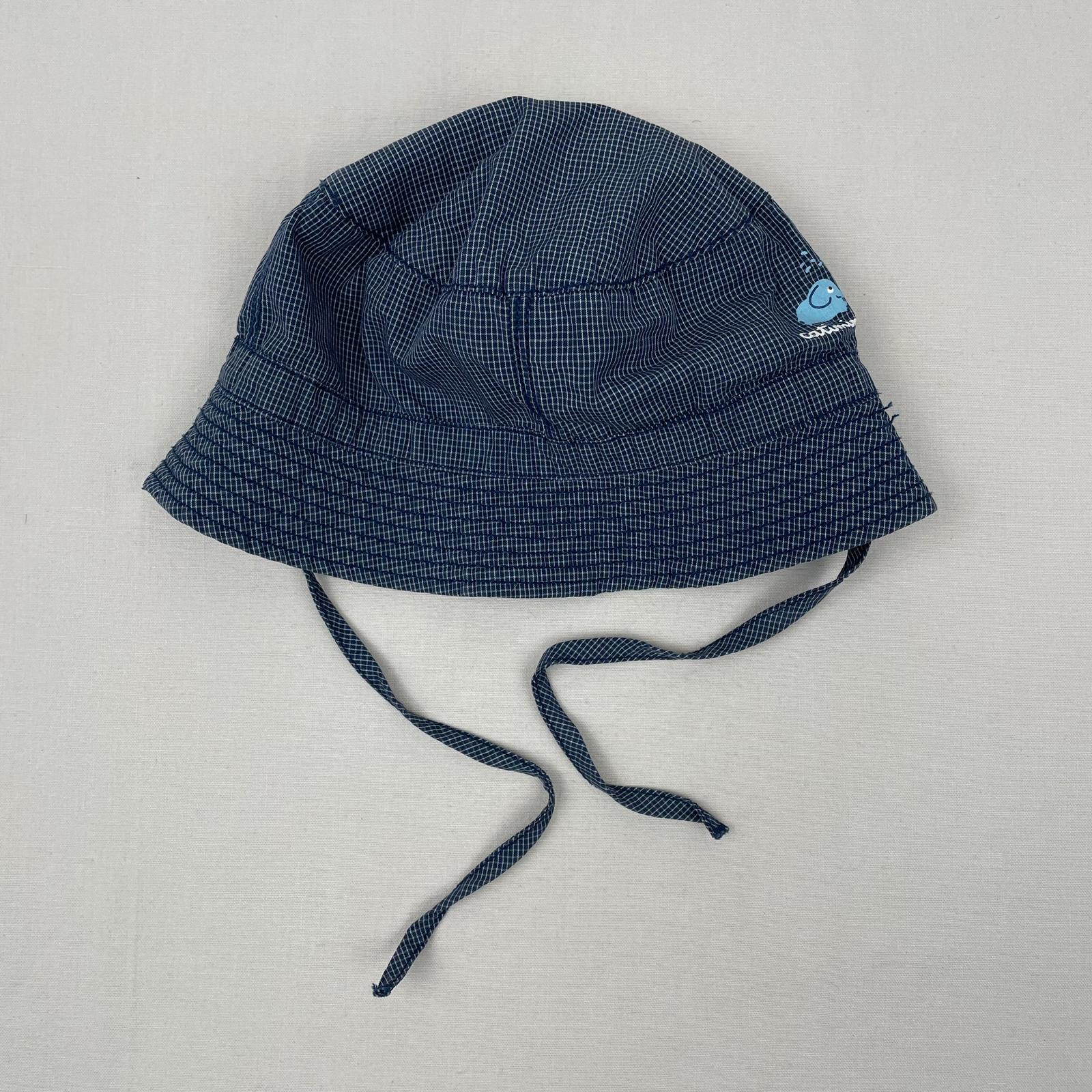 Autres commentaires : Bob avec liens à carreaux blancs, circonférence de la tête 46 cm., doublure en jersey blanc à rayures orange, motif éléphant en bleu de côté avec inscription « catimini » en blanc.