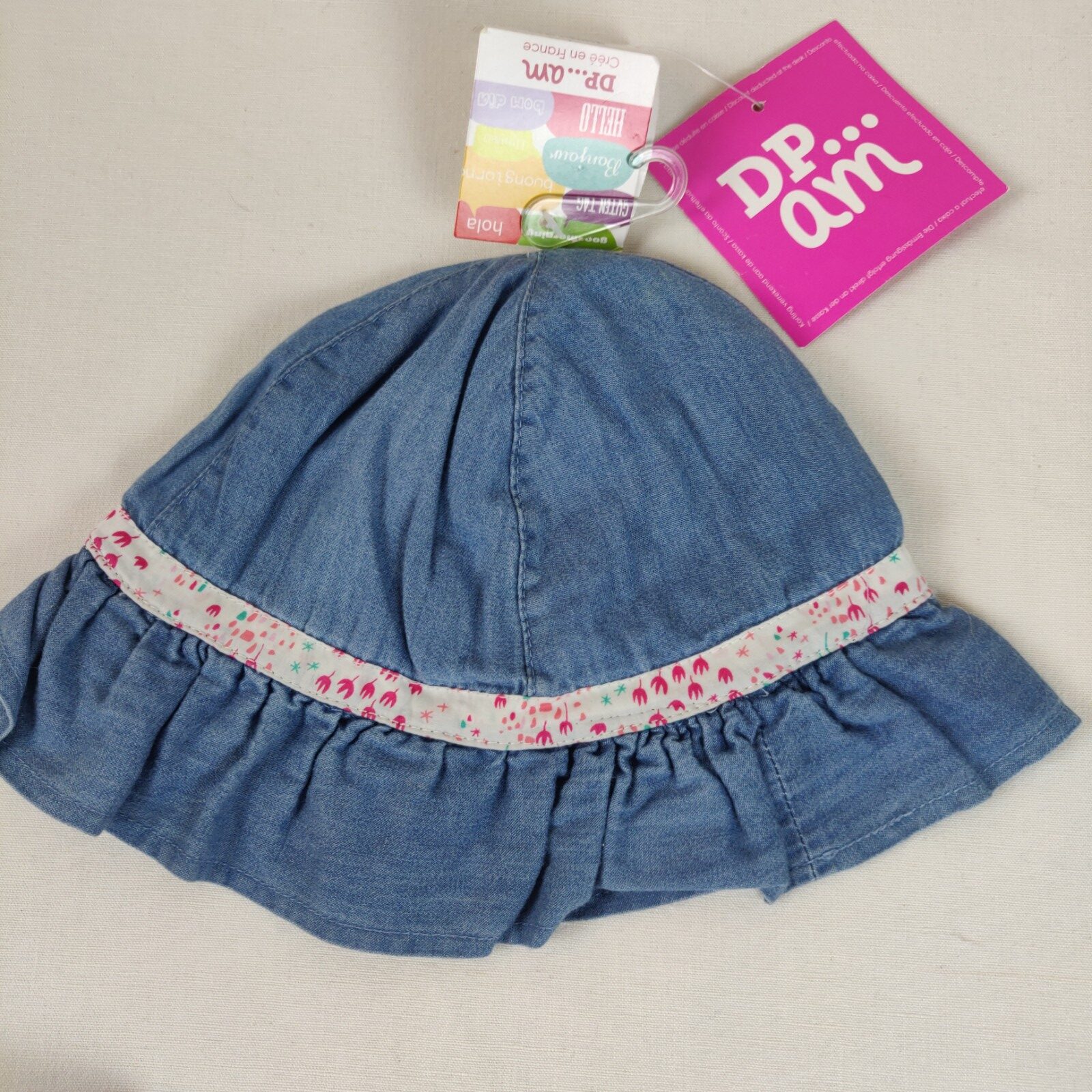 Autres commentaires : Bob imitation denim bleu (Taille 6/12 mois / 45-47 cm) avec liseré blanc à motifs fleuris et noeud décoratif assorti.