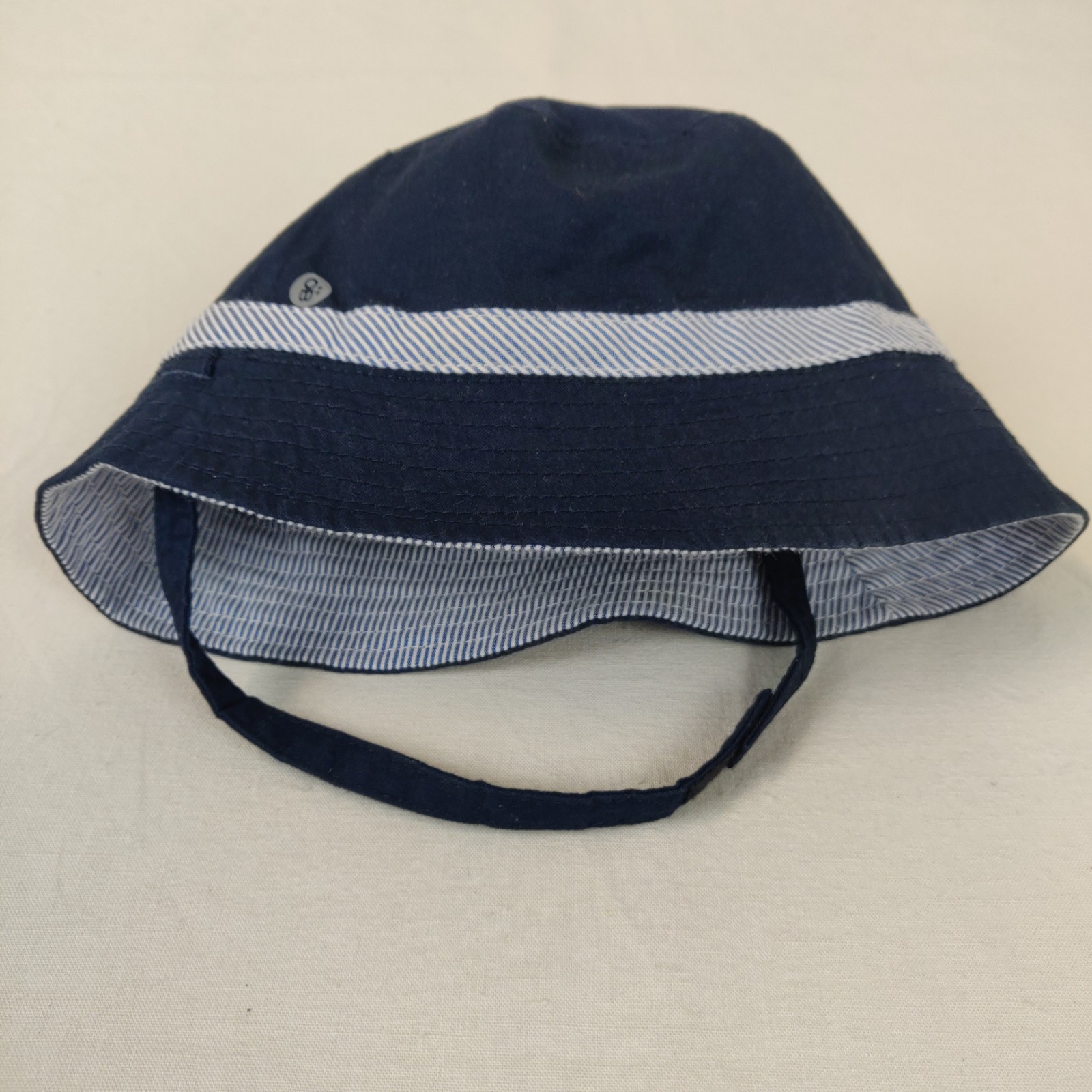 Autres commentaires : Bob réversible (49 cm). Une face bleu marine avec une bande blanche rayée bleu. Une face blanche rayée finement bleu avec une bande bleu marine. Fermeture à fines lanières à scratch.
