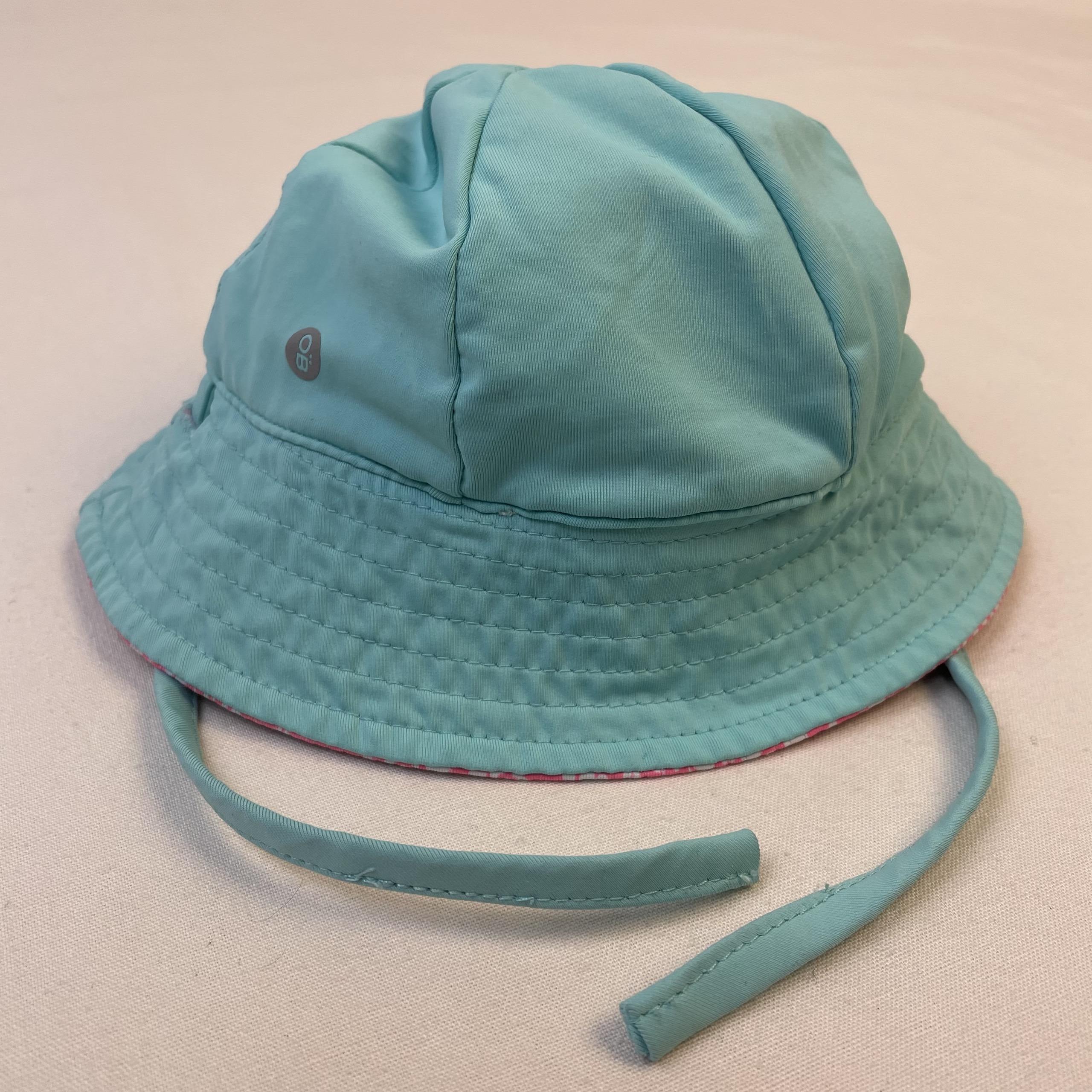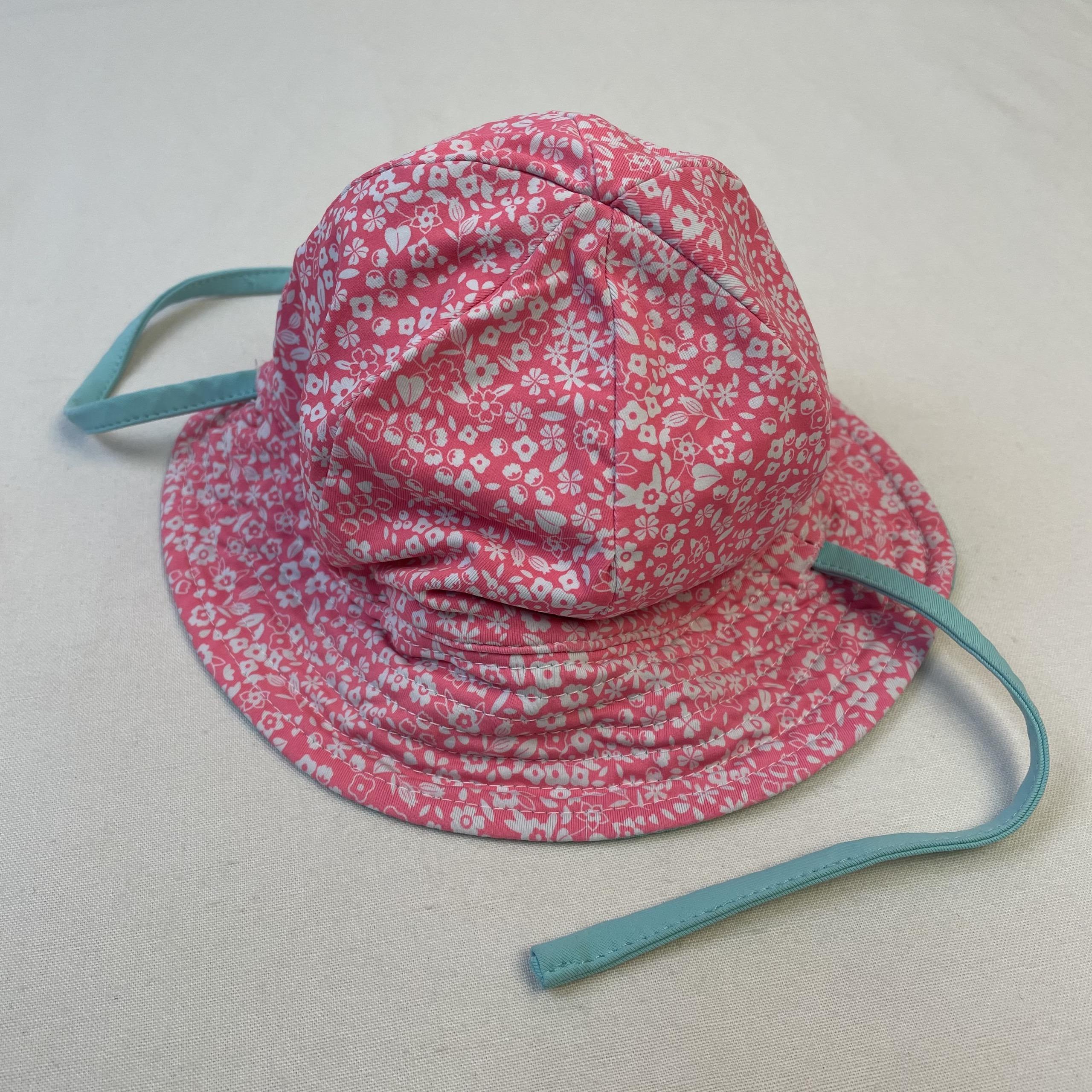 - Bob réversible avec un côté rose parsemé de petites fleurs blanches, et un côté vert d’au uni, lanières à nouer sous le menton. Taille estimée. Tour de tête 40 cm. Taille estimée 3M.