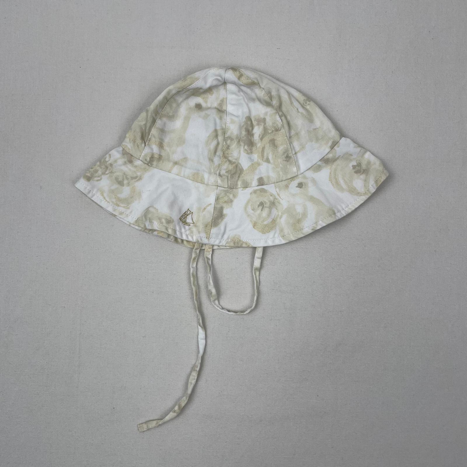 Autres commentaires : Bob avec liens, circonférence de la tête 43-45 cm., doublure du même matériau, motifs de fleurs beiges.
