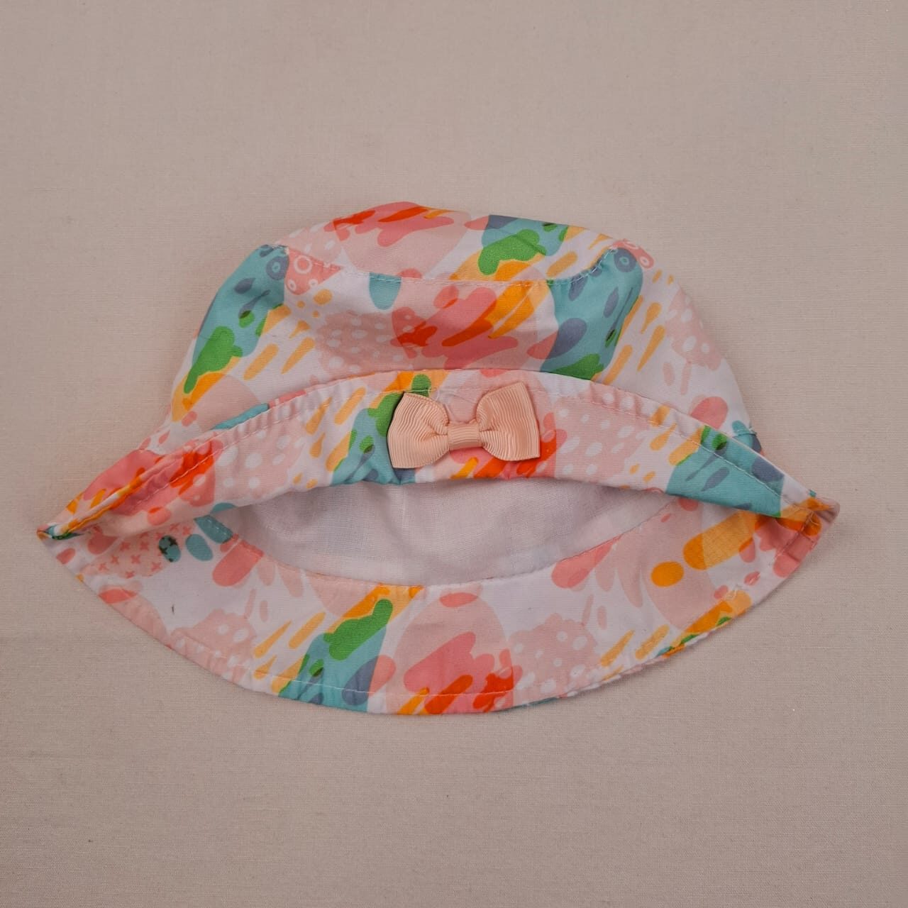 Autres commentaires : Bob blanc avec motifs multicolores, petit noeud papillon beige rosé cousu pour un effet revers à l’avant du bob.