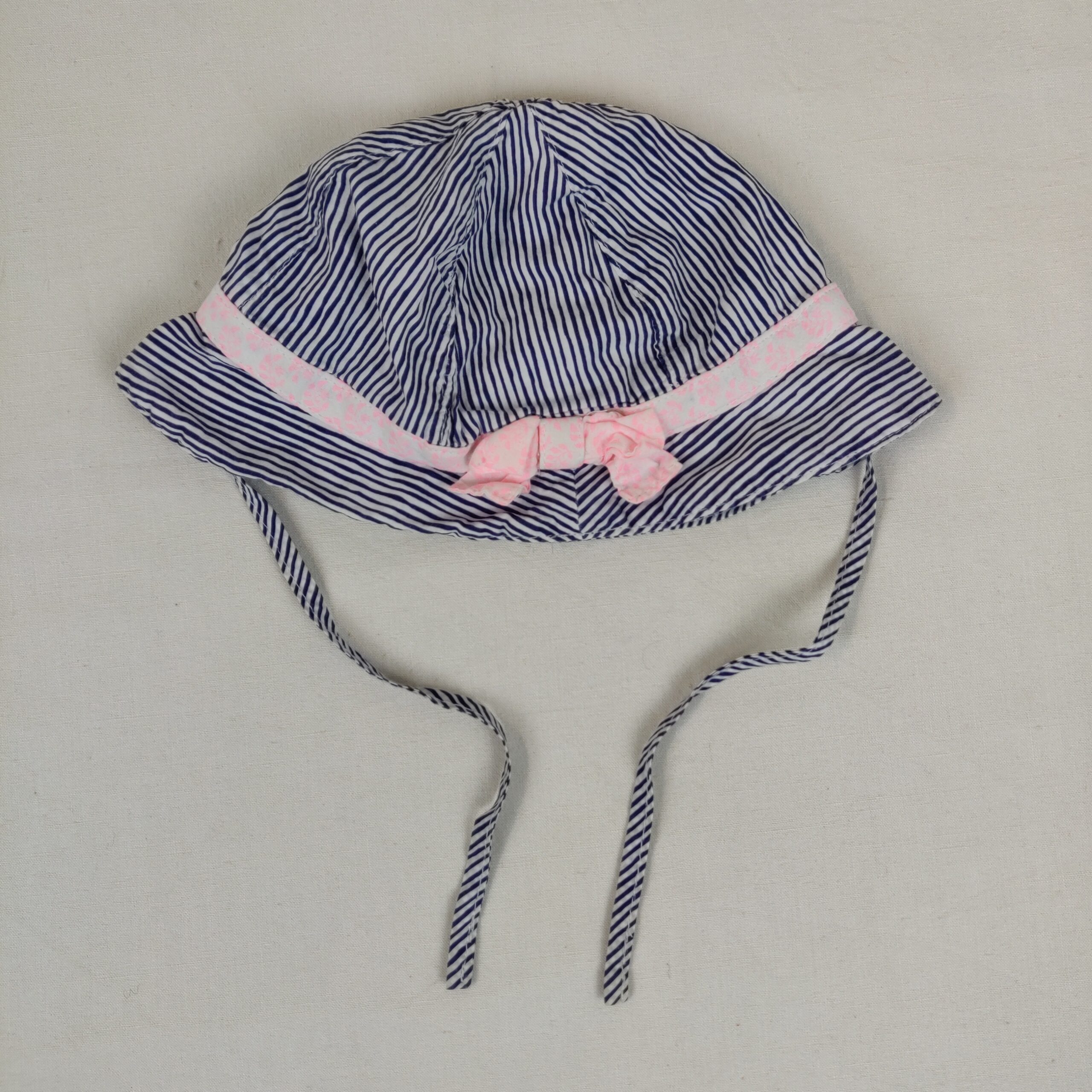 Autres commentaires : Bob bleu à rayures blanches,2 ficelles et noeds rose.