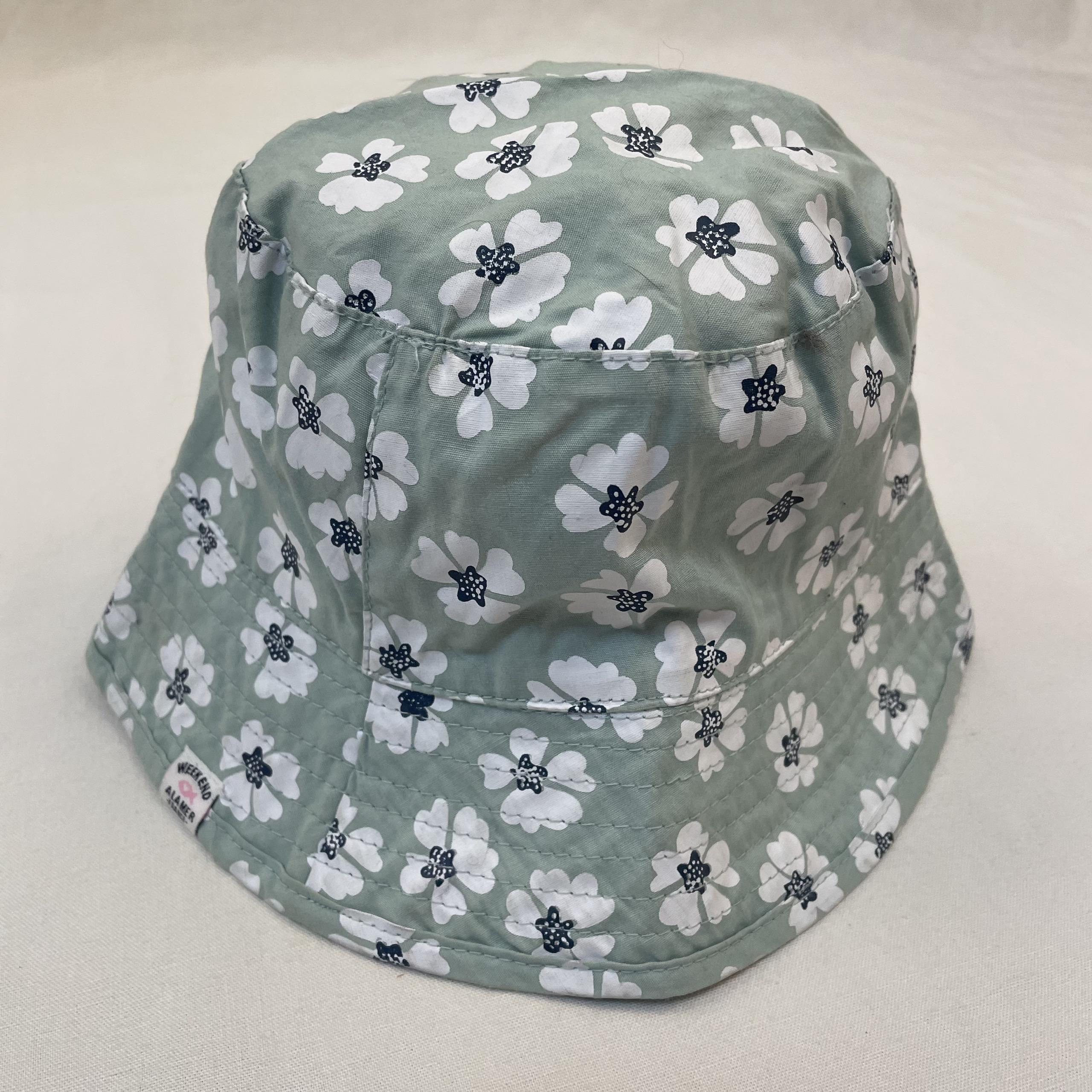 - Bob vert tilleul parsemé de fleurs blanches et noires, doublure blanche à rayures bleu marine (possiblement réversible). Tour de tête estimé 48-50 cm (18M).