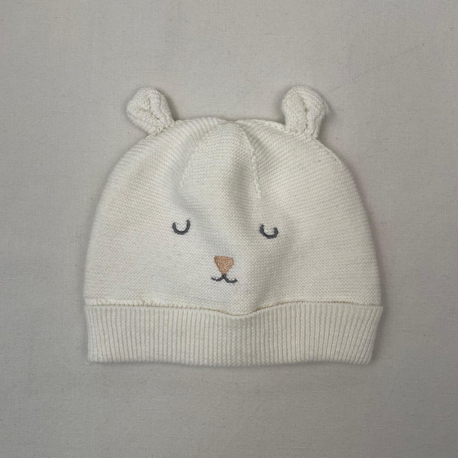 Autres commentaires : 15% Laine. Bonnet de naissance en tricot écru, avec revers, petite tête d’ours avec mini-oreilles en relief, doublure écru 100% coton.