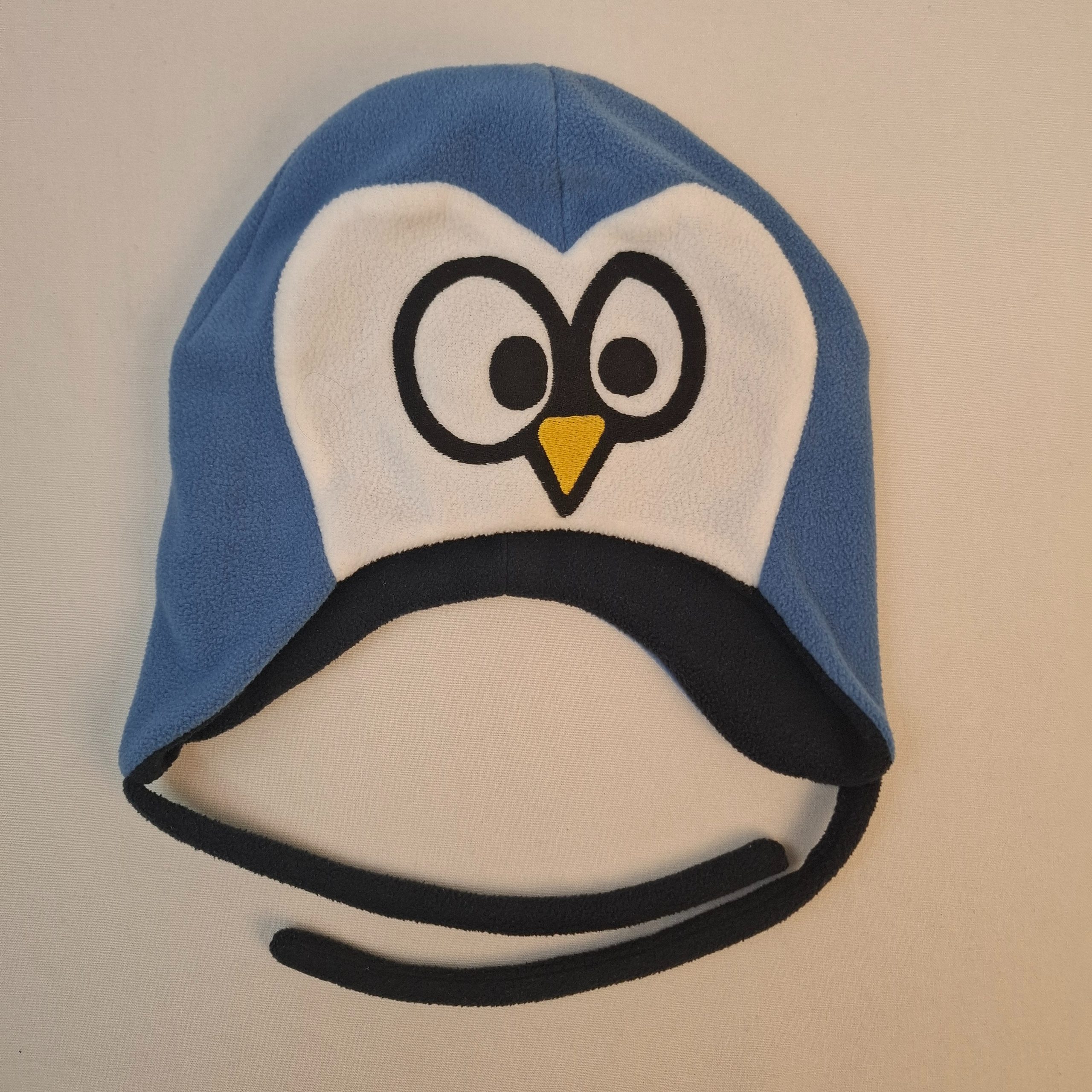 - Bonnet en polair bleu et blanc avec un visage de pingouin avec 2 languettes par oreilles.