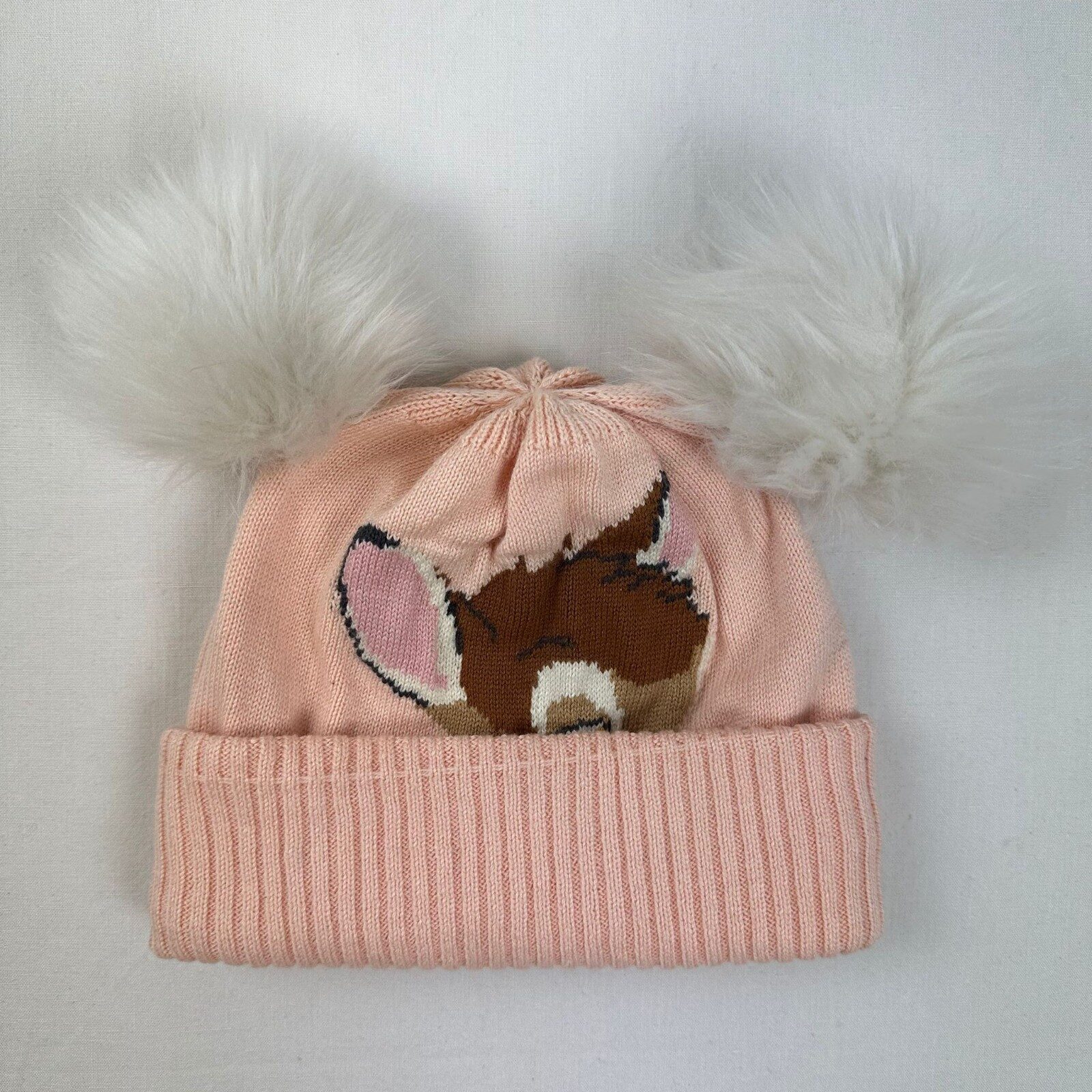 Autres commentaires : Bonnet rose avec oreillettes et motif bambi marron sur la devanture. 25% viscose et 20% nylon.