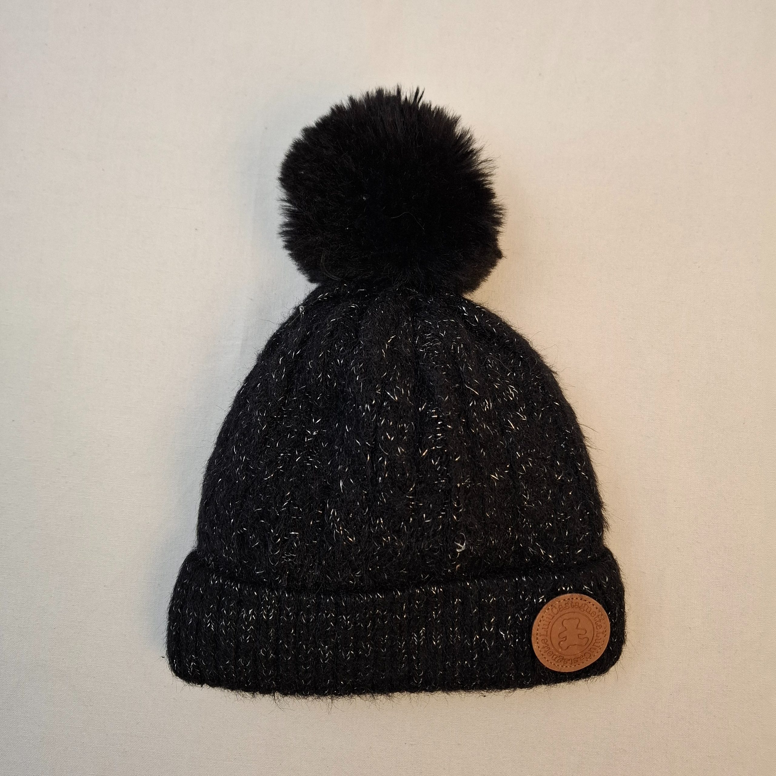 - Bonnet en tricot noir et argent surmonté d’un pompon noir, doublure en fourrure synthétique noire.