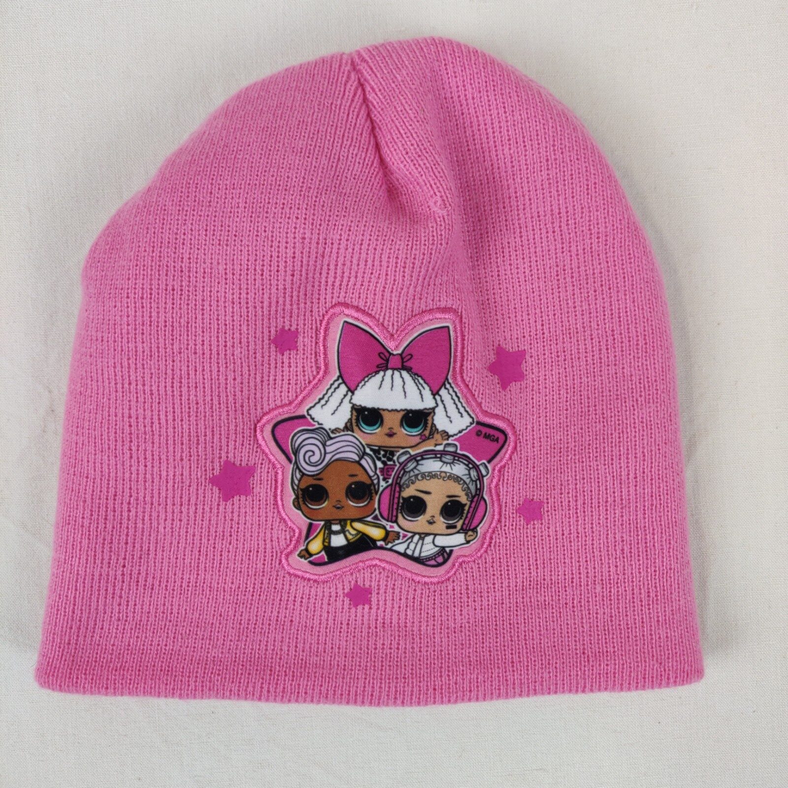 Autres commentaires : Bonnet en fines mailles – rose. Motif central poupéés LOL. Taille estimée 3 mois.