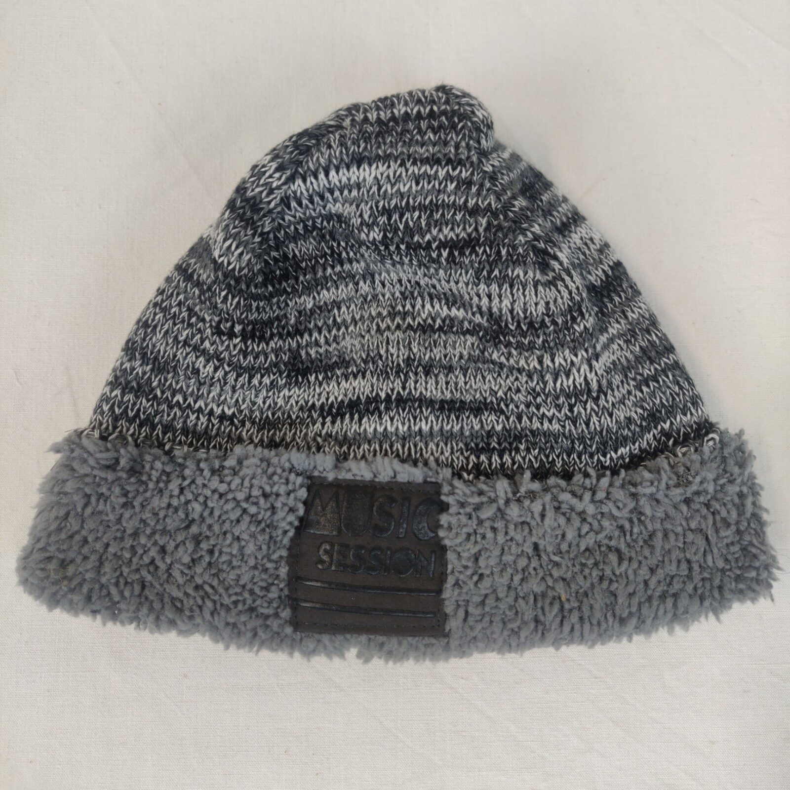 Autres commentaires : Bonnet doublé en polaire – mailles gris clair et gris foncé entremêlées. Rebord en polaire grise. Ecusson marron foncé avec inscription noire « Music session ».