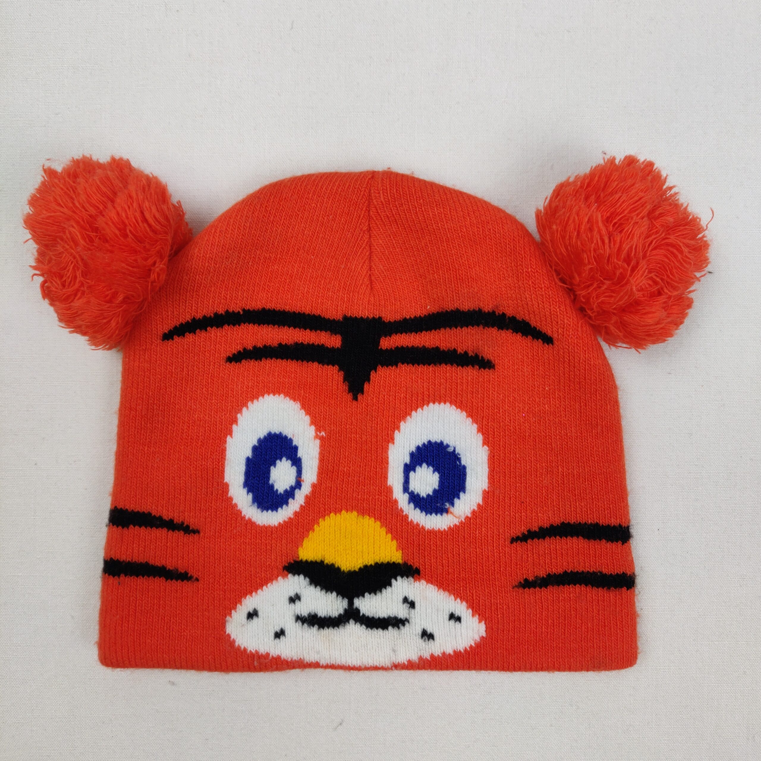 Autres commentaires : bonnet orange avec tête de tigre et deux pompons.