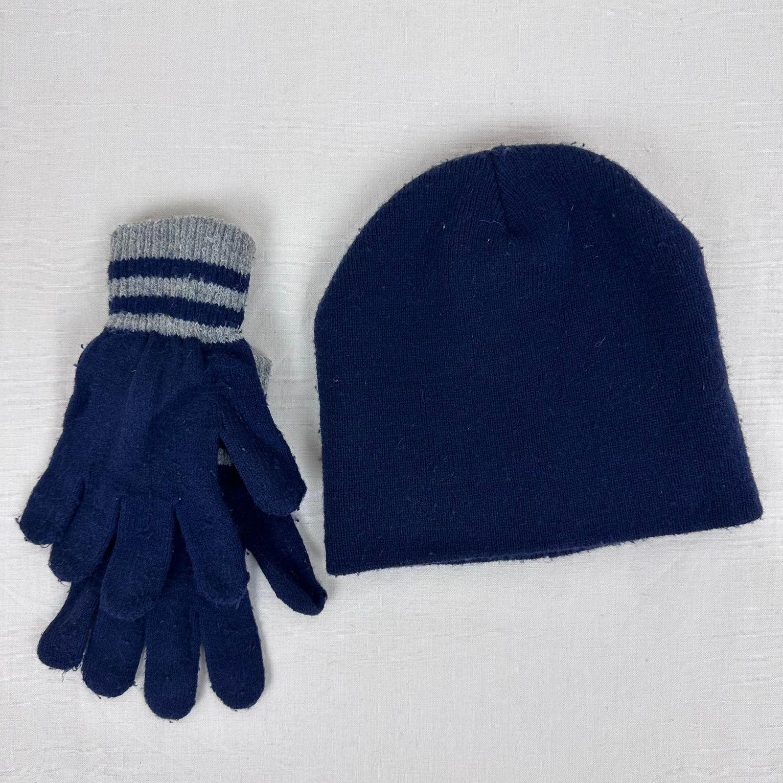 Autres commentaires : Bonnet bleu foncé accompagné de gants du même motif avec rayures gris.