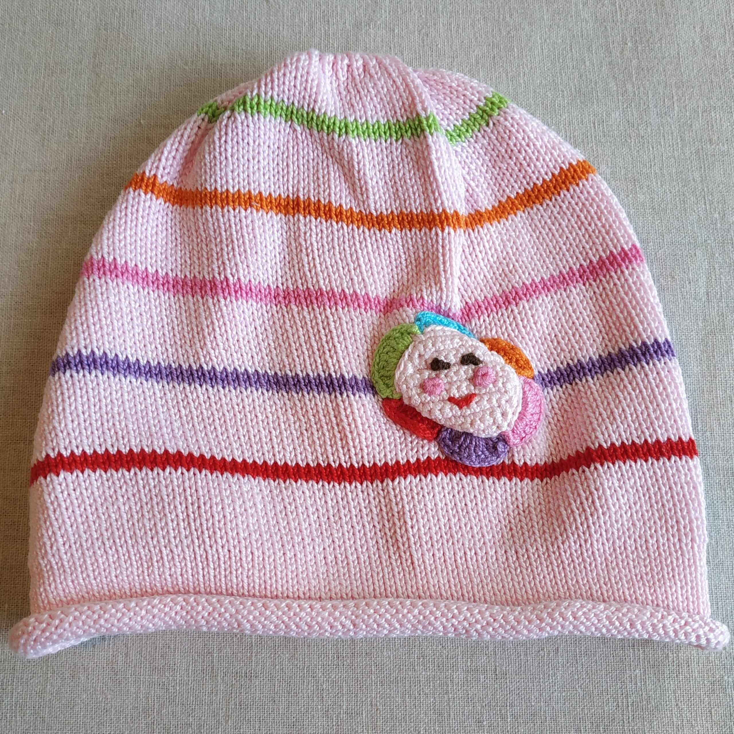 Autres commentaires : Bonnet en maille , fond rose clair à rayures rouge, violette, rose, orange et verte. Motif fleur en crochet appliqué avec visage souriant.