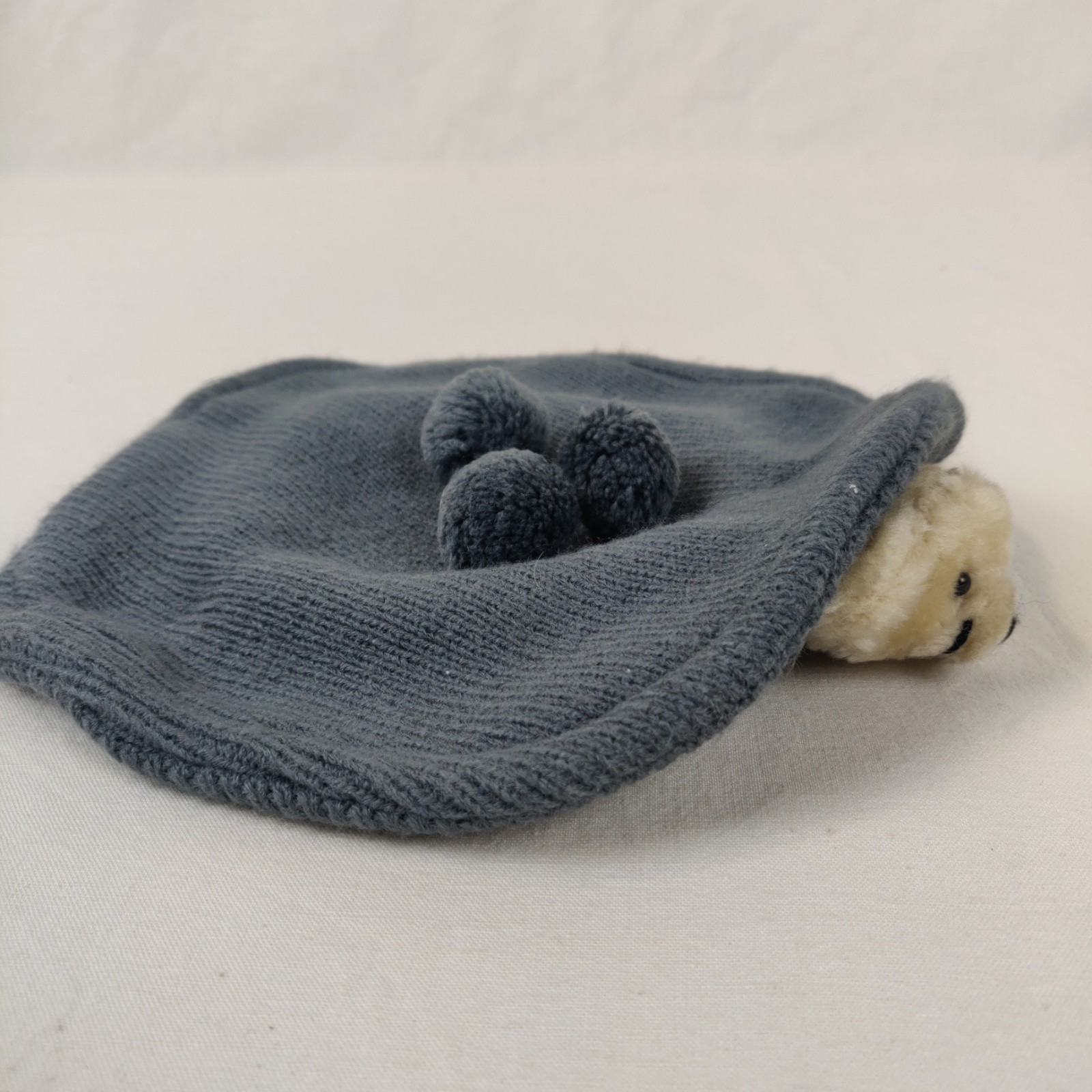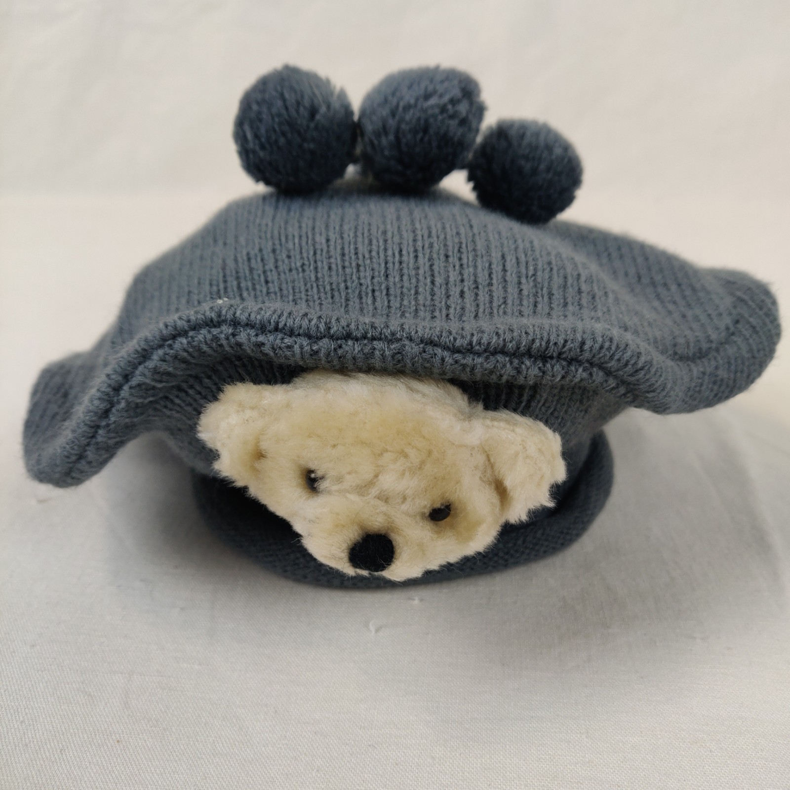 Autres commentaires : Béret en fines mailles grises. 3 pompons au sommet. Une mini peluche petit ours au devant.
