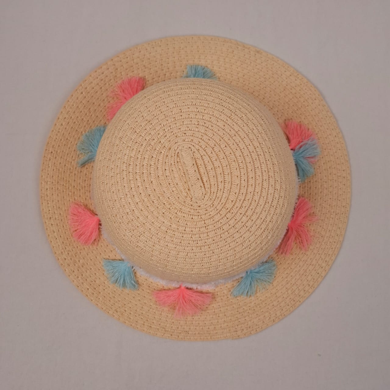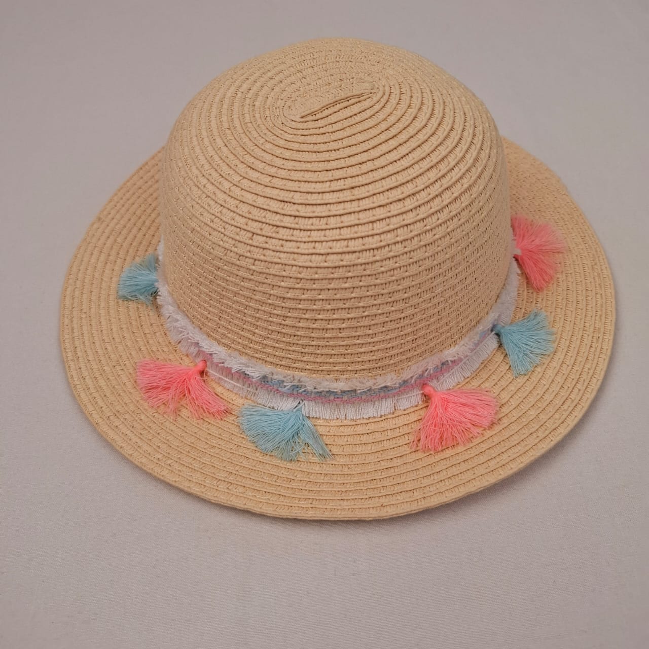 Autres commentaires : Chapeau en papier beige paille avec ruban tissu bleu et rose tour de tête 50 cm