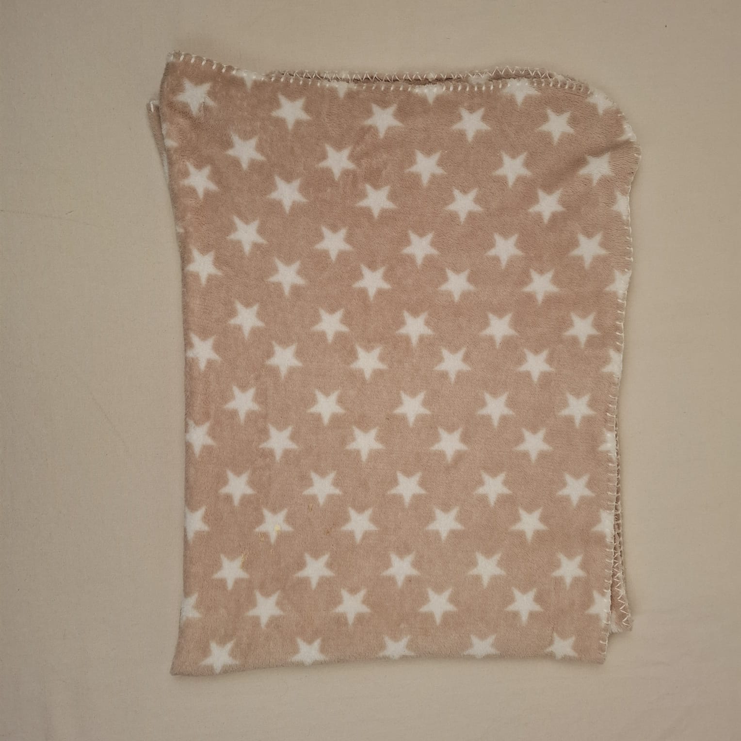 Autres commentaires : Plaid beige, motifs étoiles, matière douce et chaude, composée d’une polaire à poils mi-longs, 1OOx87cm.