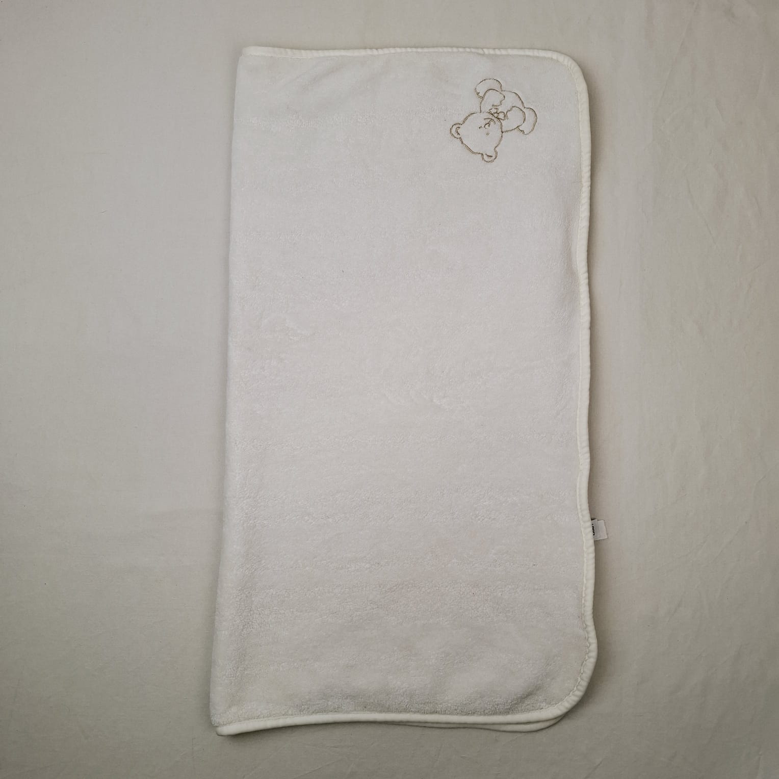 Autres commentaires : Couverture bébé en fourrure couleur ivoire toute douce avec liseré crème, petit ours en peluche dessiné dans un des coins.