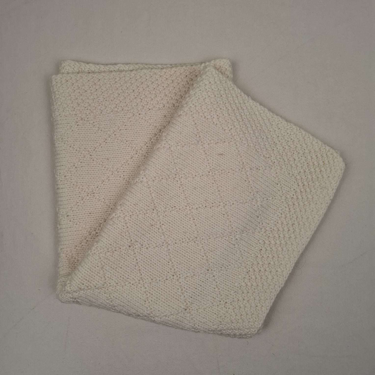 Autres commentaires : Couverture en maille blanche écrue, motifs losanges.