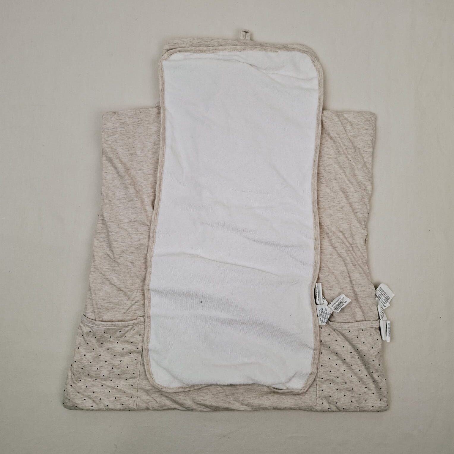 Autres commentaires : Matelas à langer à liens beige, motifs étoiles, fermeture par bouton, 2 poche.