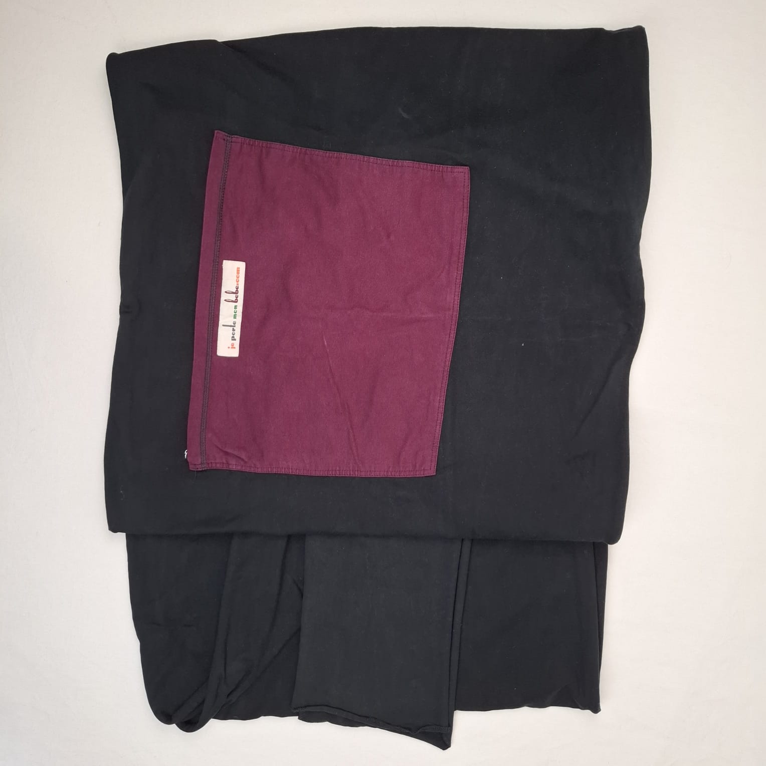 Autres commentaires : 5% élasthanne. Echarpe de portage noir, marque « Je porte mon bébé » JPMM devenue Love radius maintenant, une grande poche centrale violette, pour bébés de 2kg à 14kg