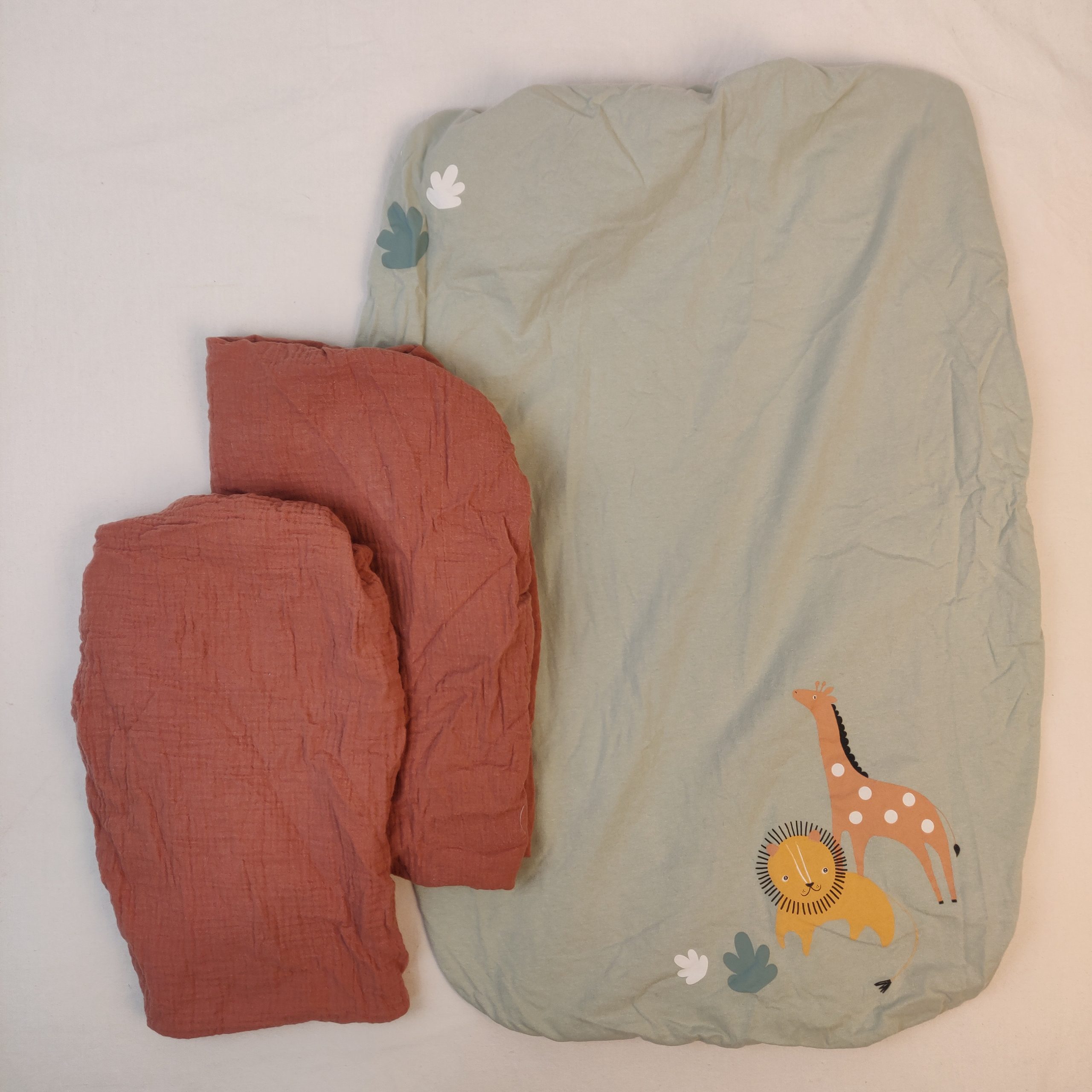 - Lot de 3 draps housses de matelas à langer, le premier est de la marque verbaudet de couleur vert clair avec comme motif des petits animals brodé, avec une dimension de 72 × 48 cm Les deux autres draps housse sont de la marque La Redoute de couleur orange foncé et de dimension 72 × 48 cm.