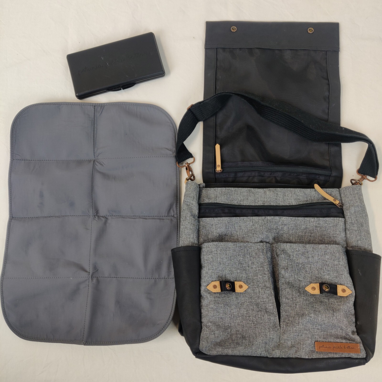 Autres commentaires : Sac à langer – gris chiné et noir. Ouverture par rabat pressionné. 2 grands compartiments centraux. Quatre compartiments externes. Poches et pochette zippée. Tapis à langer gris. Boite noire à lingettes . Anse pour un porter épaule.