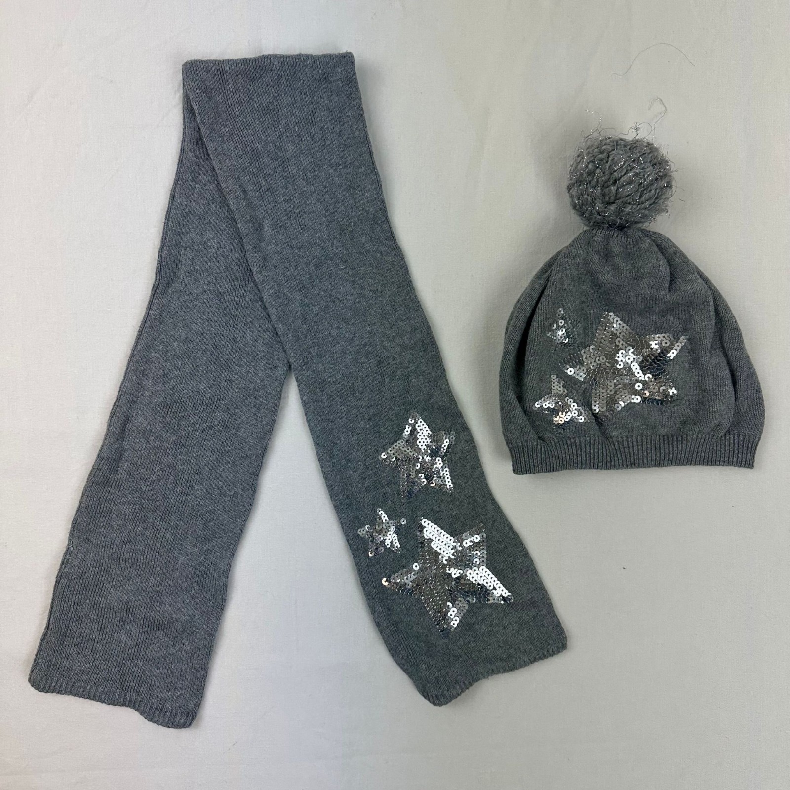 Autres commentaires : Bonnet gris avec pailettes au milieu. Echarpe grise avec motif étoile en paillette. Taille estimée 18M