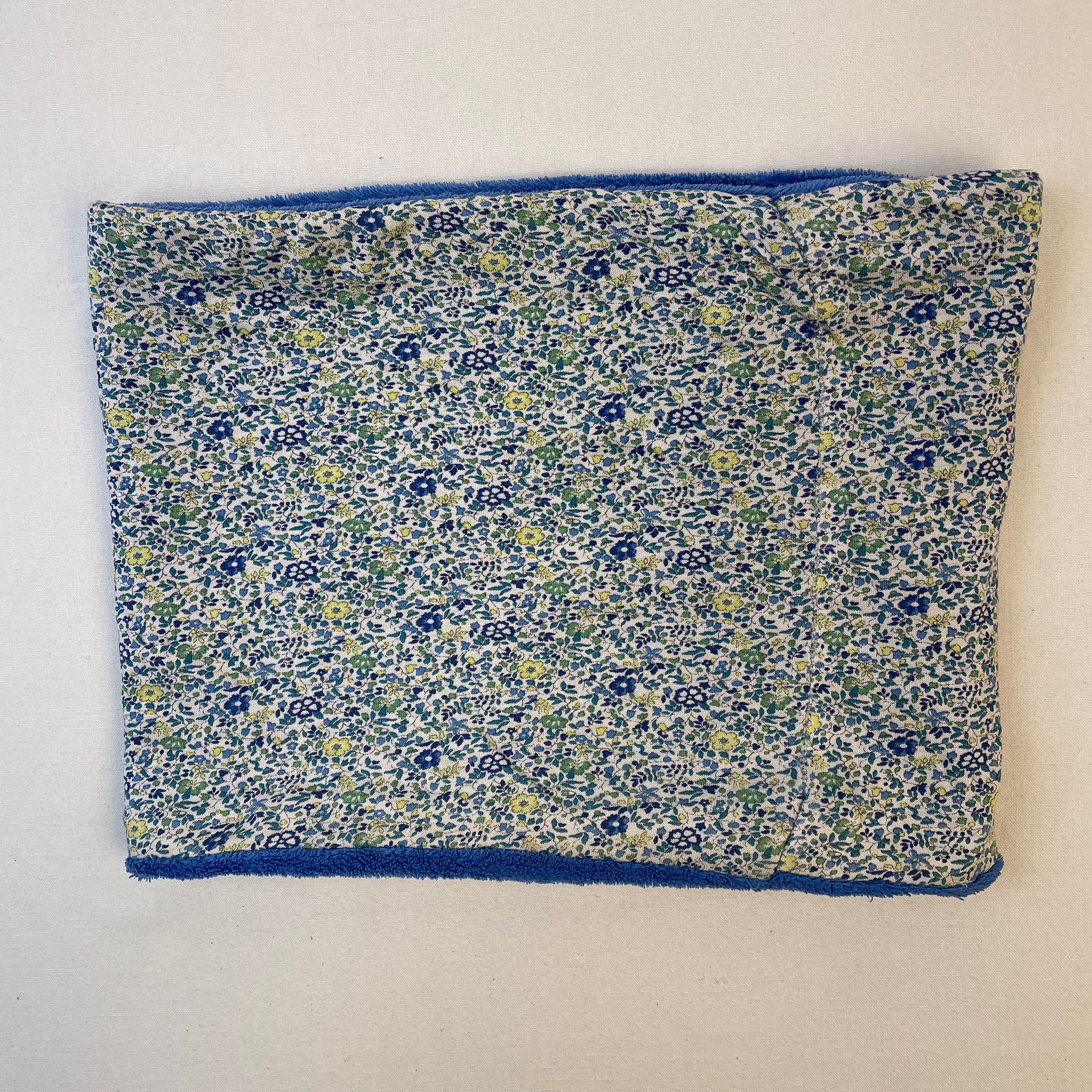 - cache-cou réversible, un côté en fourrure bleue, l’autre à motif fleuri