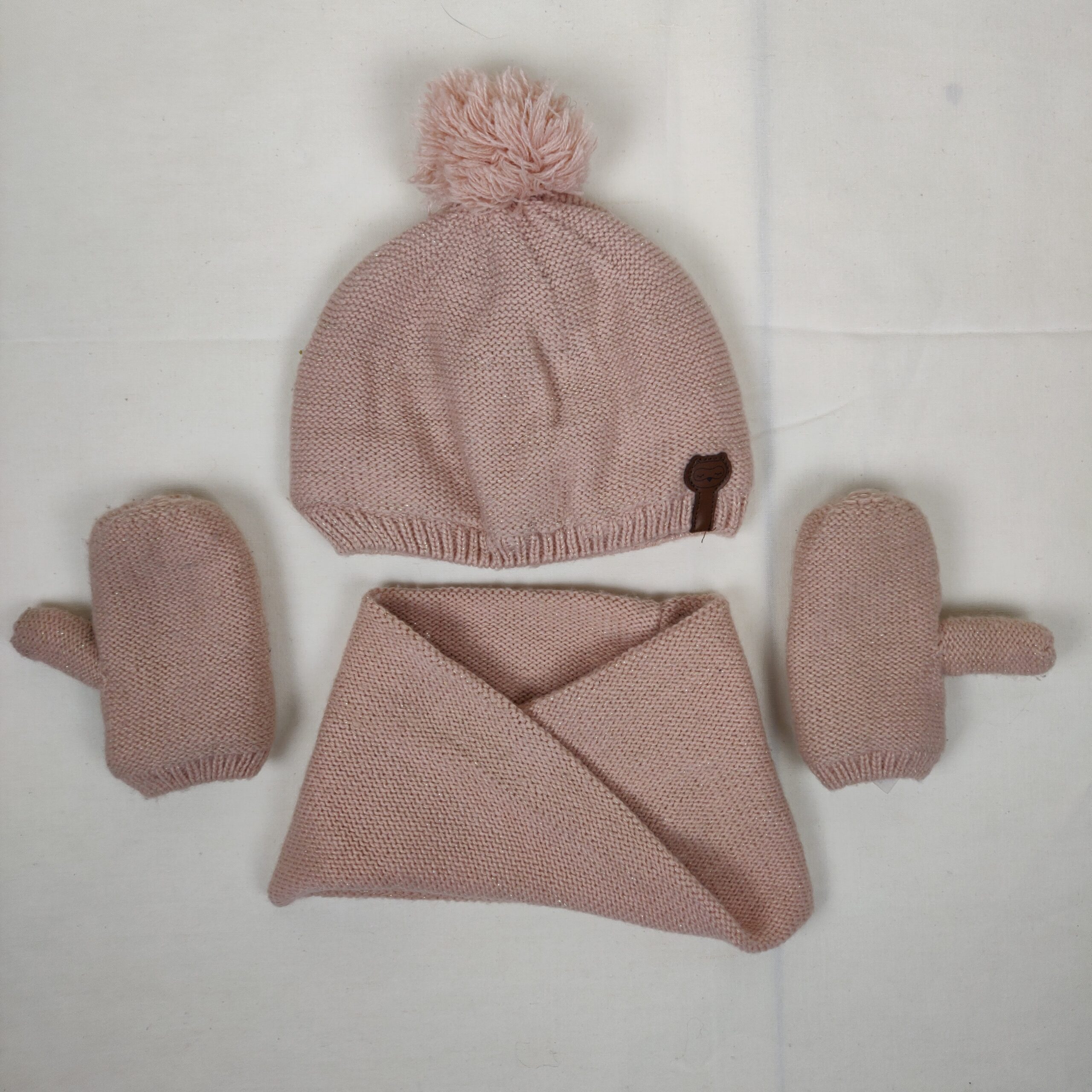 Autres commentaires : Bonnet à pompom doublé, tour de cou et paire de moufles à maille à fil légèrement pailleté – légères bouloches sur le bonnet