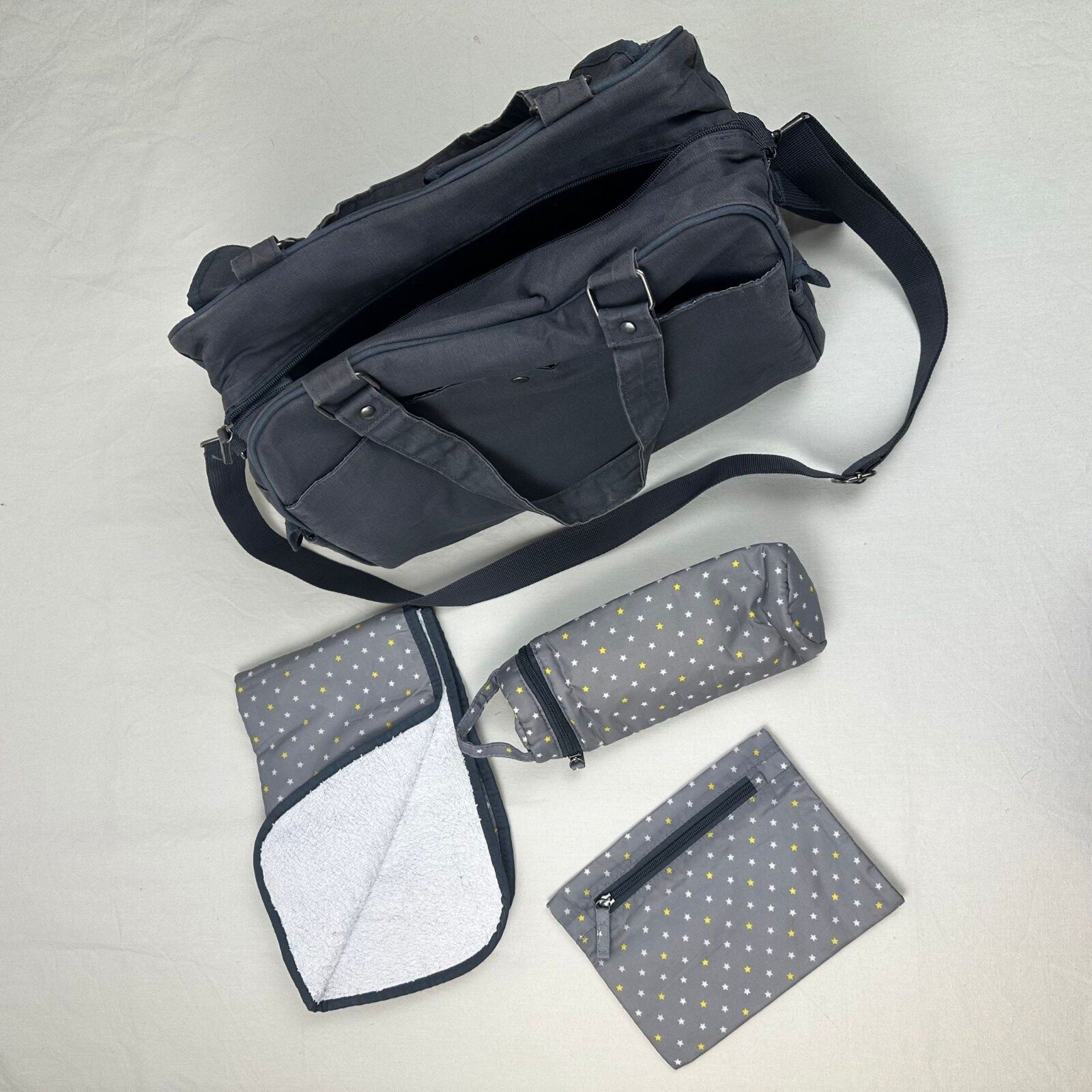 Autres commentaires : Sac à langer avec 3 accessoires: pochette zippée (16 x 23 cm), porte-biberon isotherme et tapis à langer. Contient 2 poches sur les côtés pour petite bouteille d’eau, doudou…