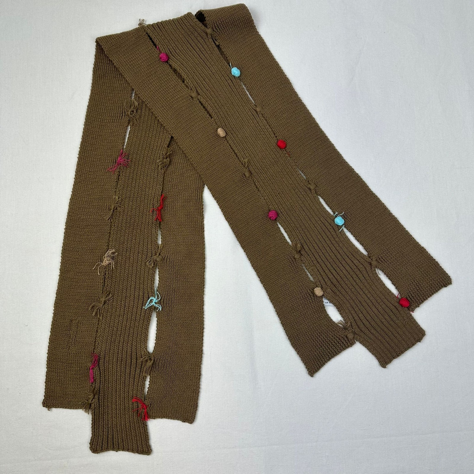 Autres commentaires : 30% acrylique. Echarpe marron en maille avec motif de boules multicolores.