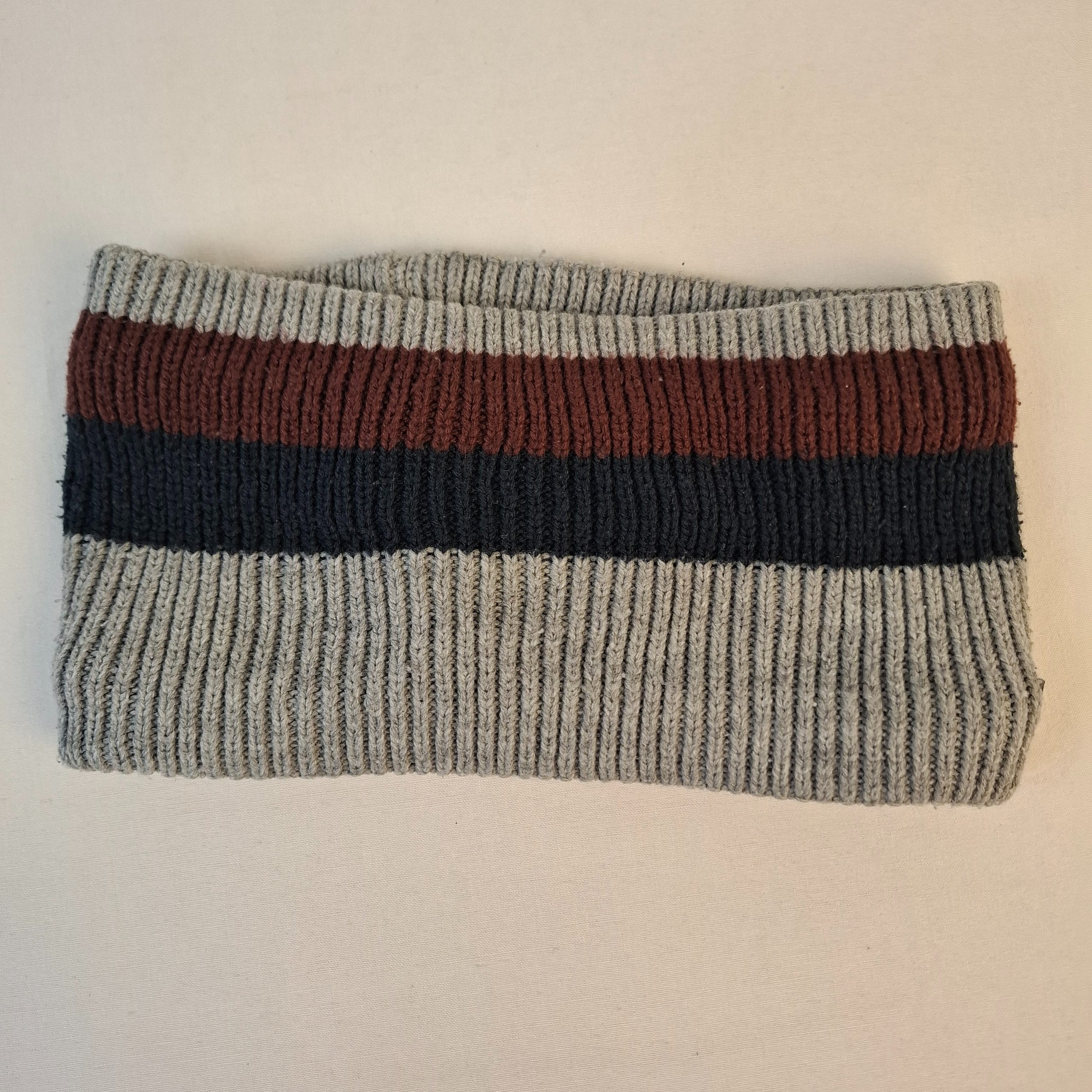 - Cache-cou gris avec bandes bordeaux et bleues avec une doublure en polaire.