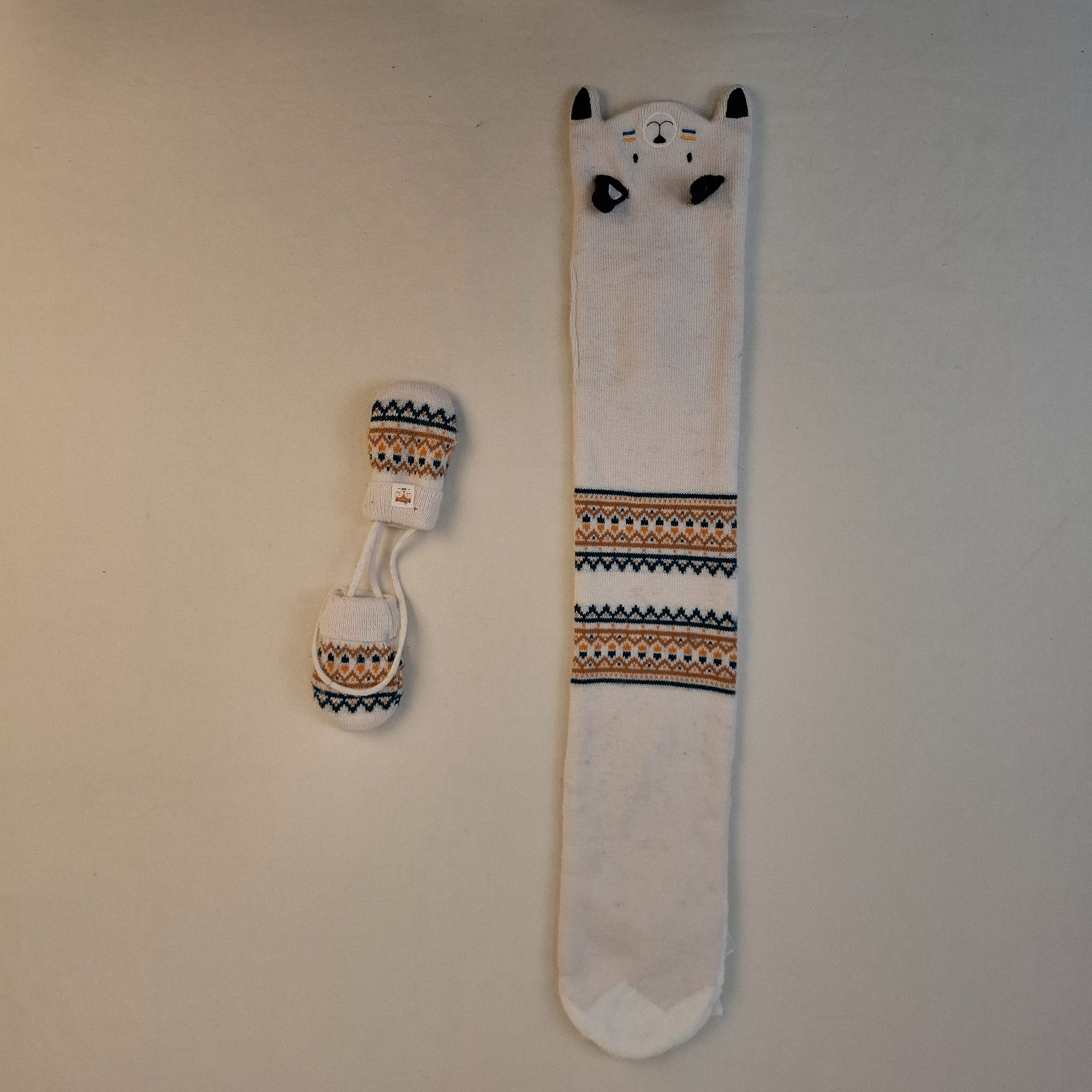 - Echarpe et moufles assorties. Extérieur en maille et intérieur en fourrure synthétique blanche.