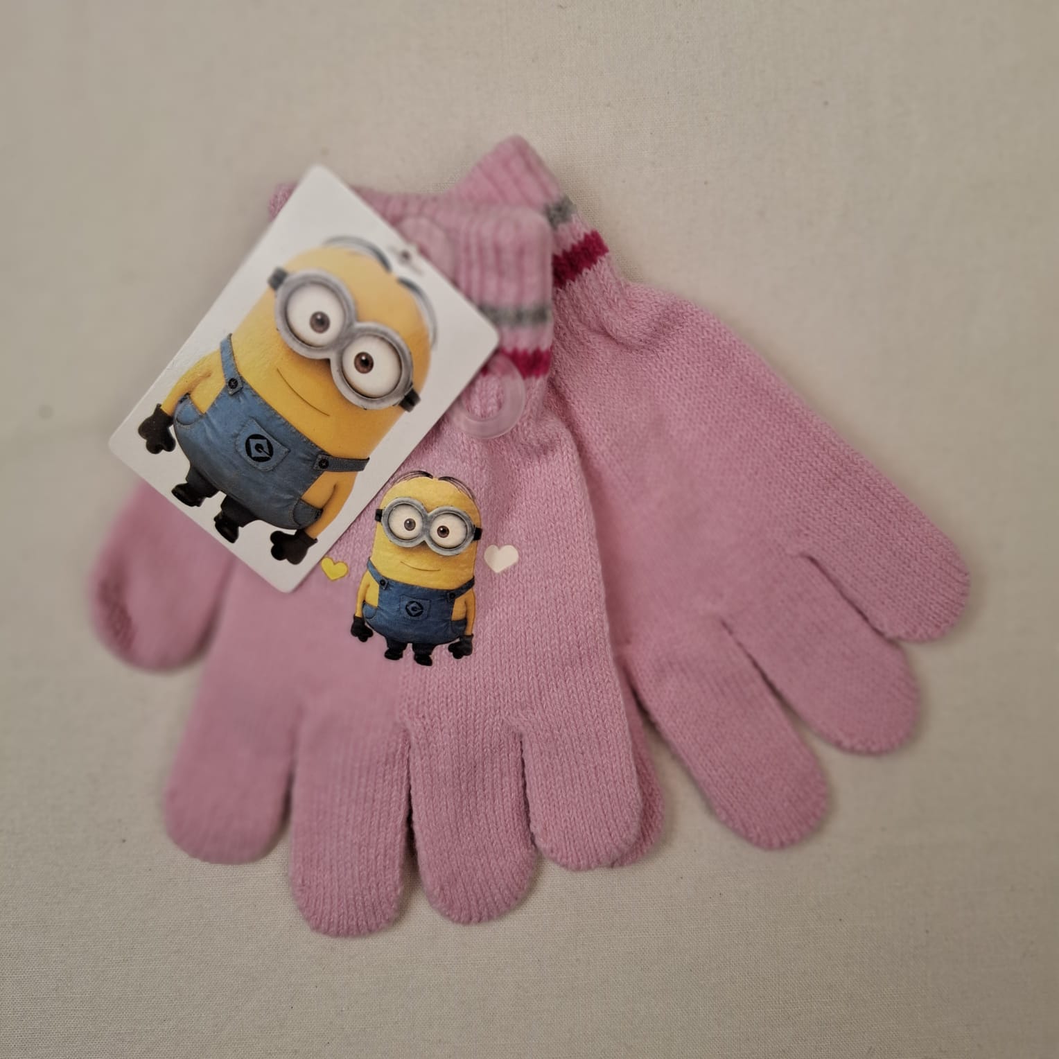 Autres commentaires : Paire de gants en maille rose, motif minion.