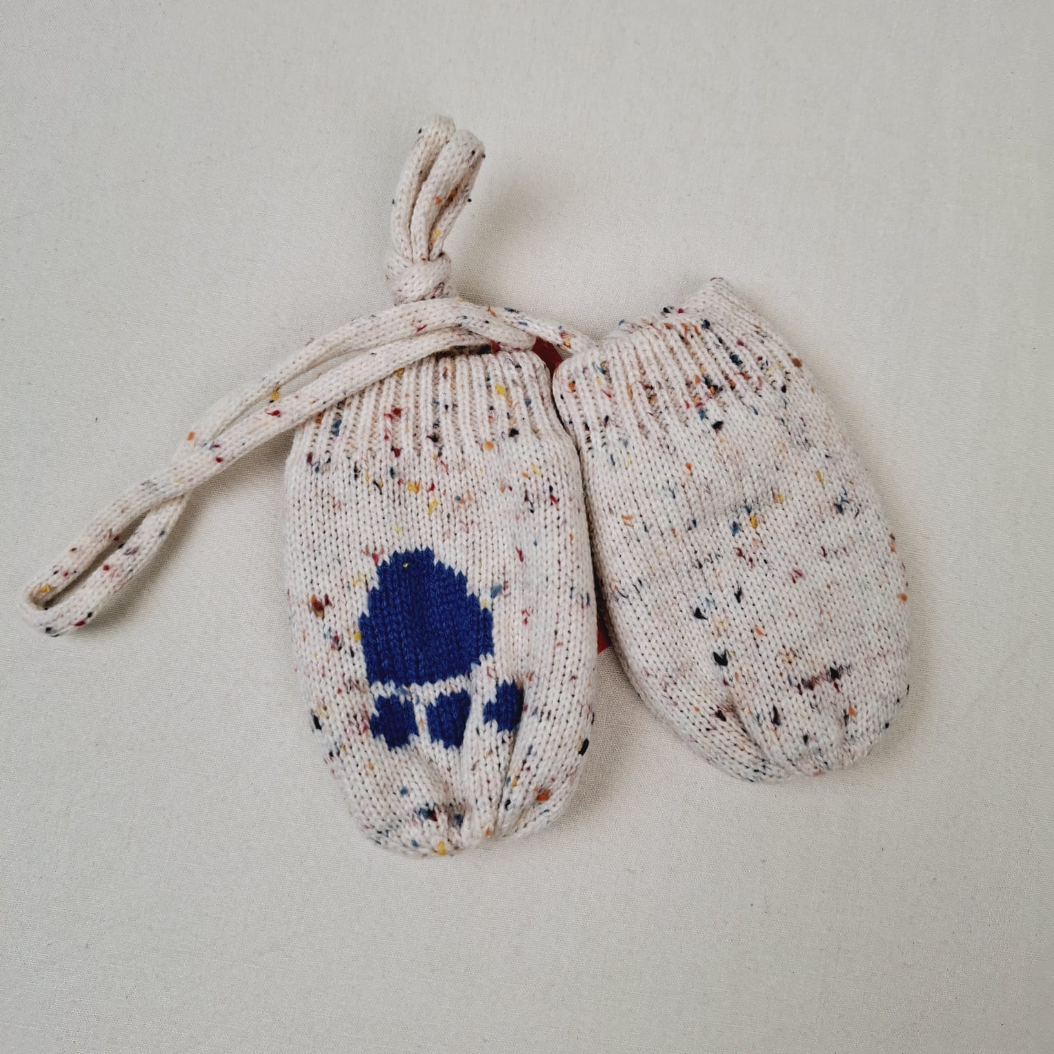 Autres commentaires : Moufles en tricot écru chiné, motif patte d’ours sur le devant, reliées par un cordon en tricot à passer dans le manteau afin de ne pas perdre les moufles, fourrées à l’intérieur 100% polyester.