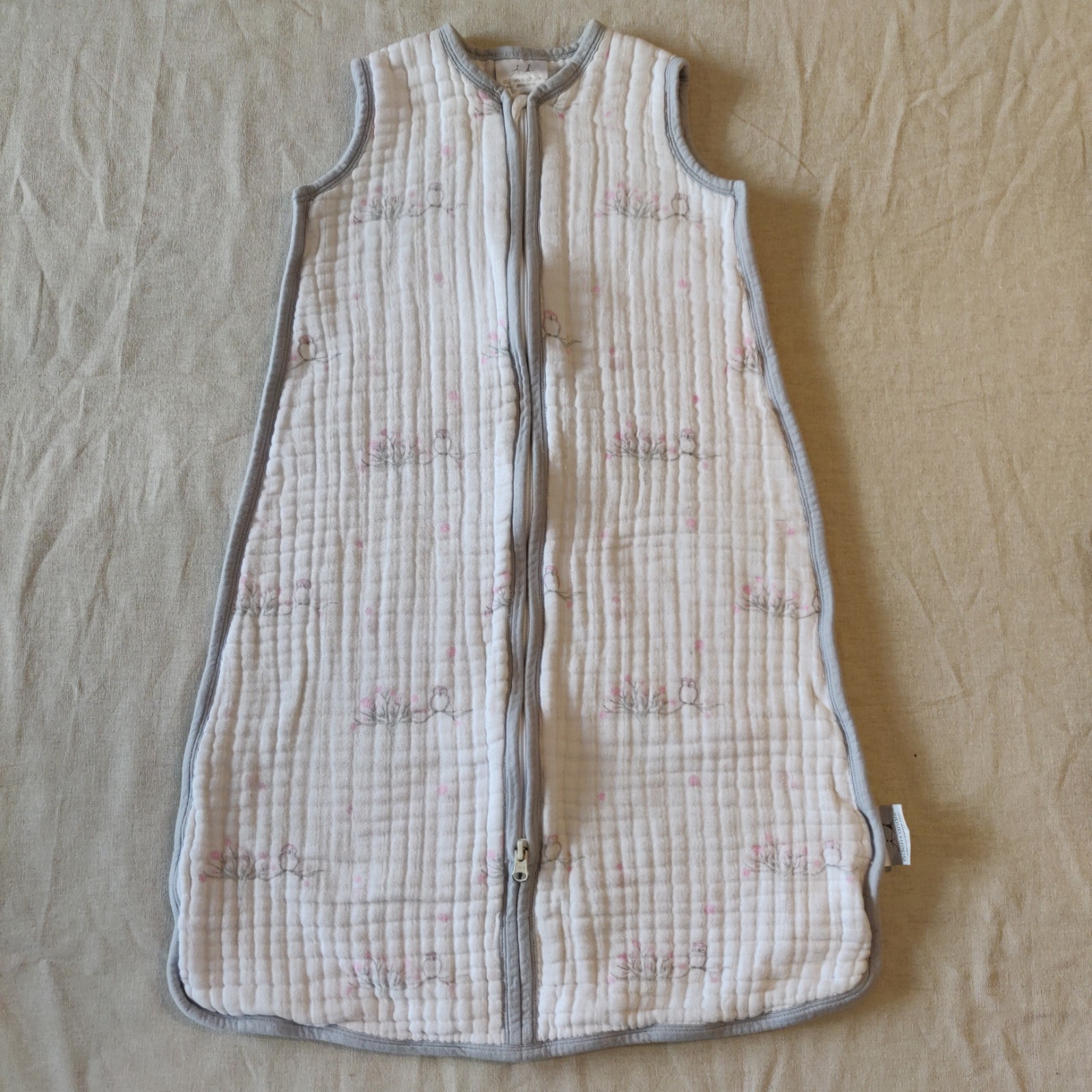 Autres commentaires : TOG 1.7 : gigoteuse de mi-saison 6 à 12 mois, blanche avec dessins d’oiseaux roses et gris sur des arbres à fruits roses, en très bon état, quelques bouloches d’usage.