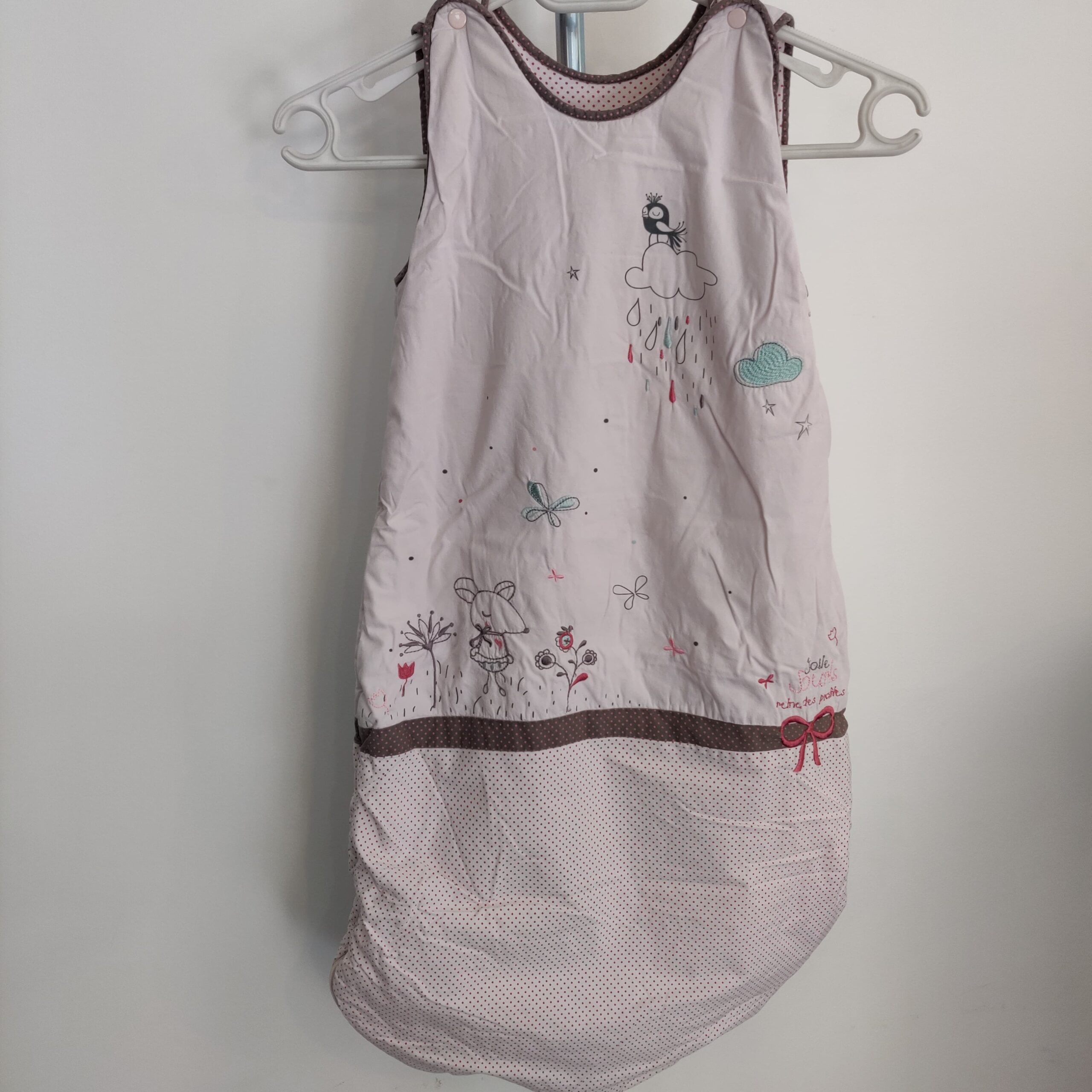 Autres commentaires : Doublure 100% polyester. Thème Jolie Souris reine des prairies, motifs brodés sur fond rose pâle. 0 à 18 mois, boutons permettant de raccourcir la gigoteuse. TOG estimé 2.5.