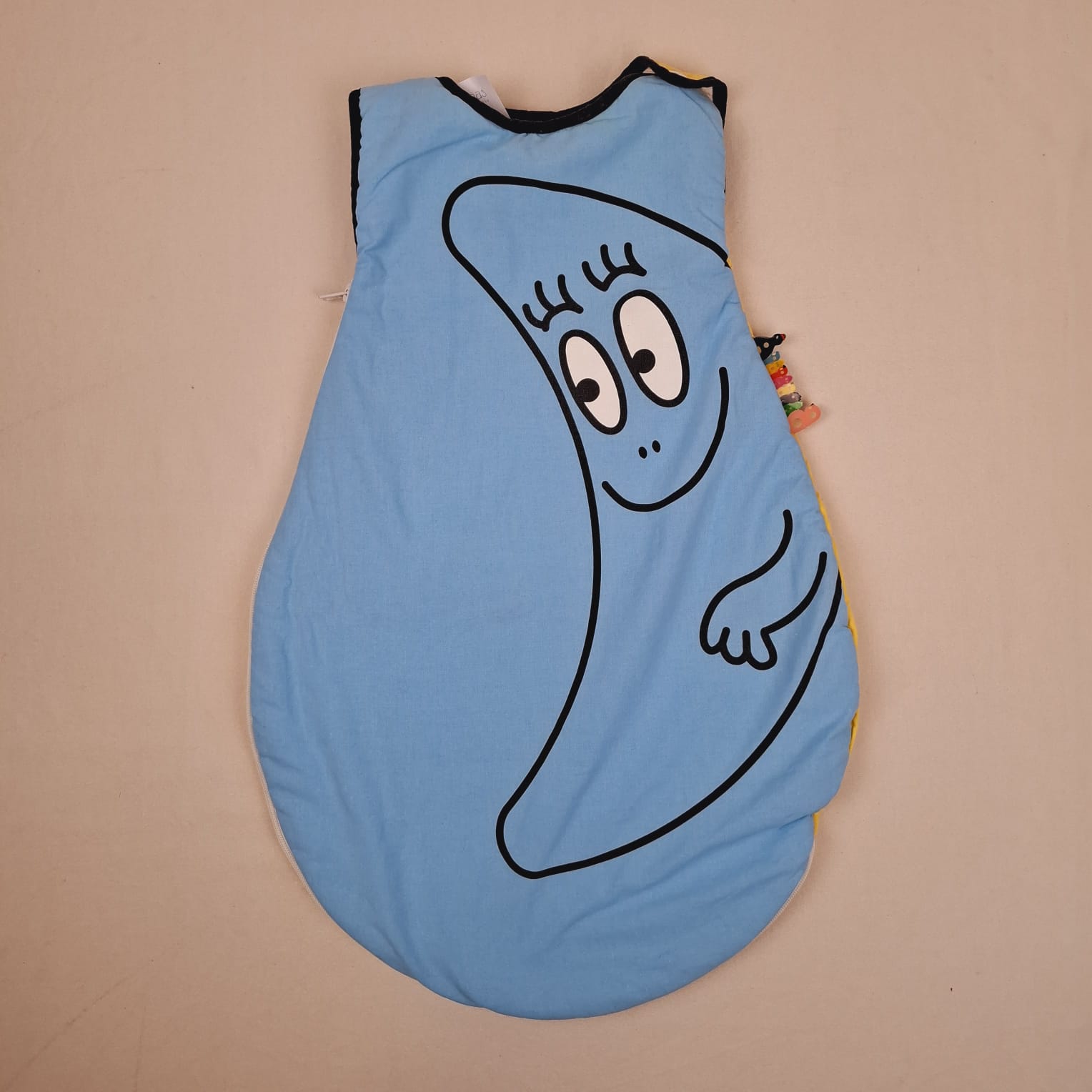 Autres commentaires : 48% coton. Gigoteuse mi-saison jaune et bleu clair, thème Barbapapa, doublure 100% coton, garnissage 100% polyester, fermeture par zip et par boutons pression sur les épaules.