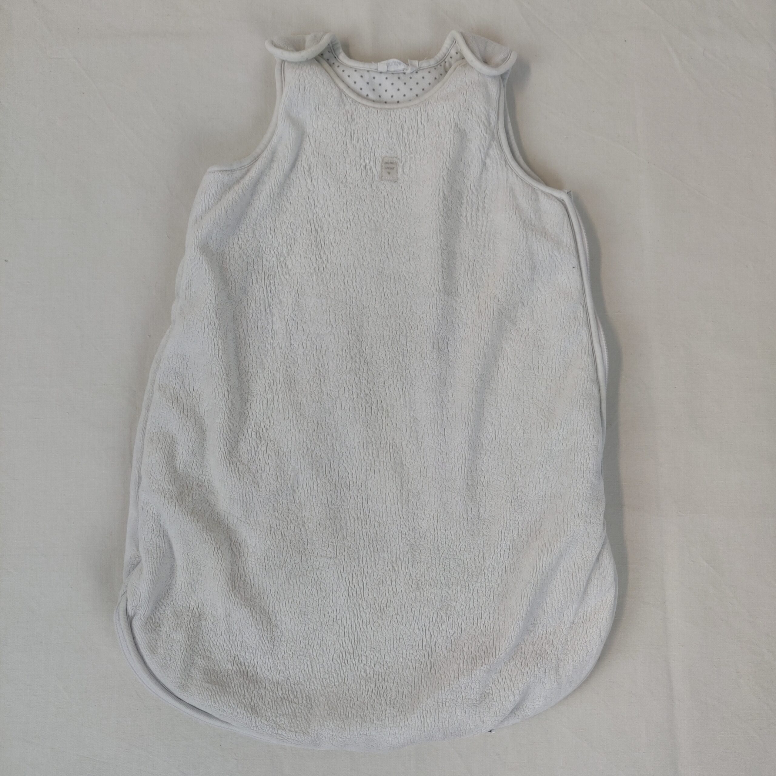 Autres commentaires : 20% polyester. Gigoteuse, turbulette doublée en velours – blanc (0-3 mois). Ouverture latérale zippée. Ouverture au niveau des bretelles à une pression. Usure normale.