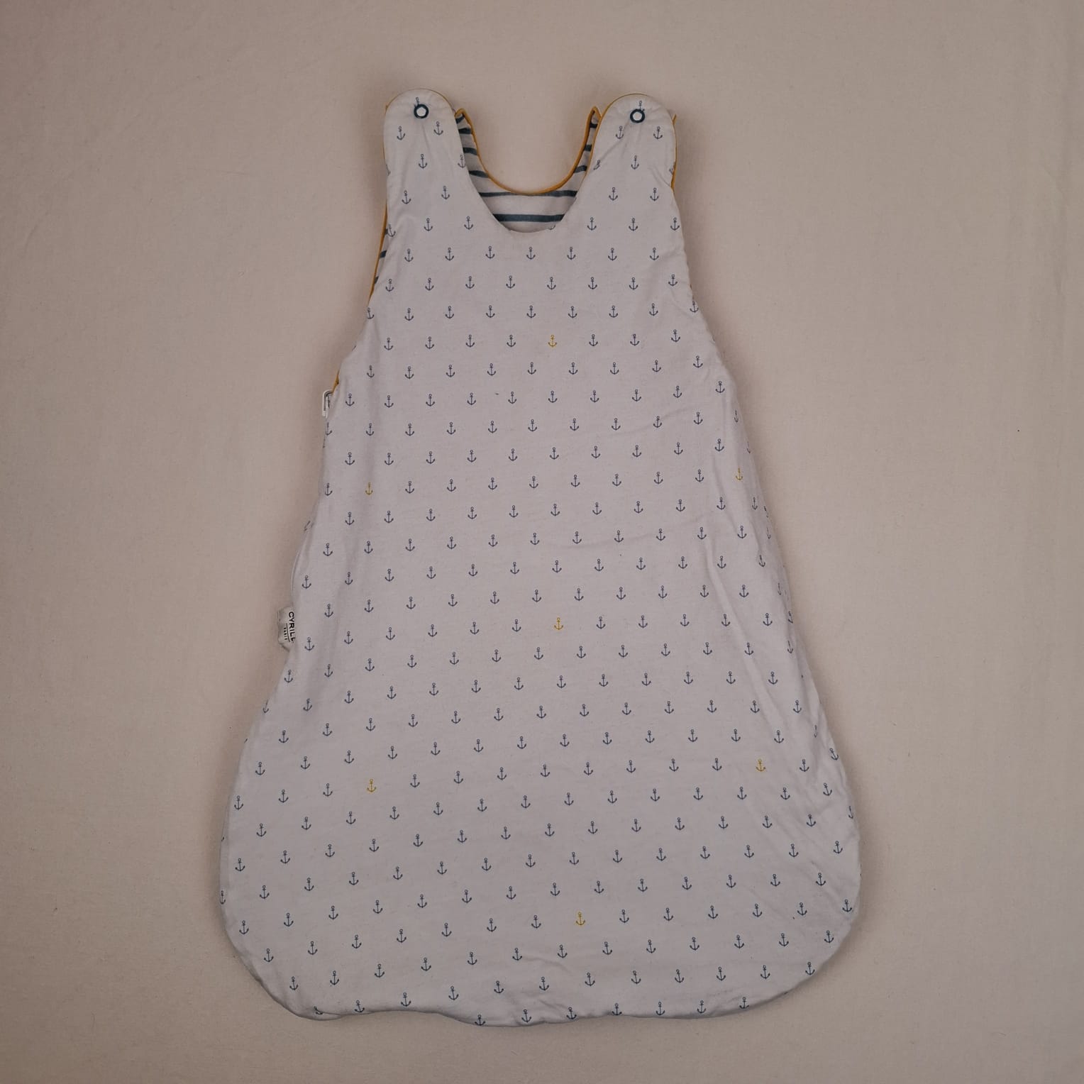 Autres commentaires : Gigoteuse Cyrillus blanche avec motifs ancres , fermeture éclaire sur le côtés et boutons pressions au niveau des bretelles.