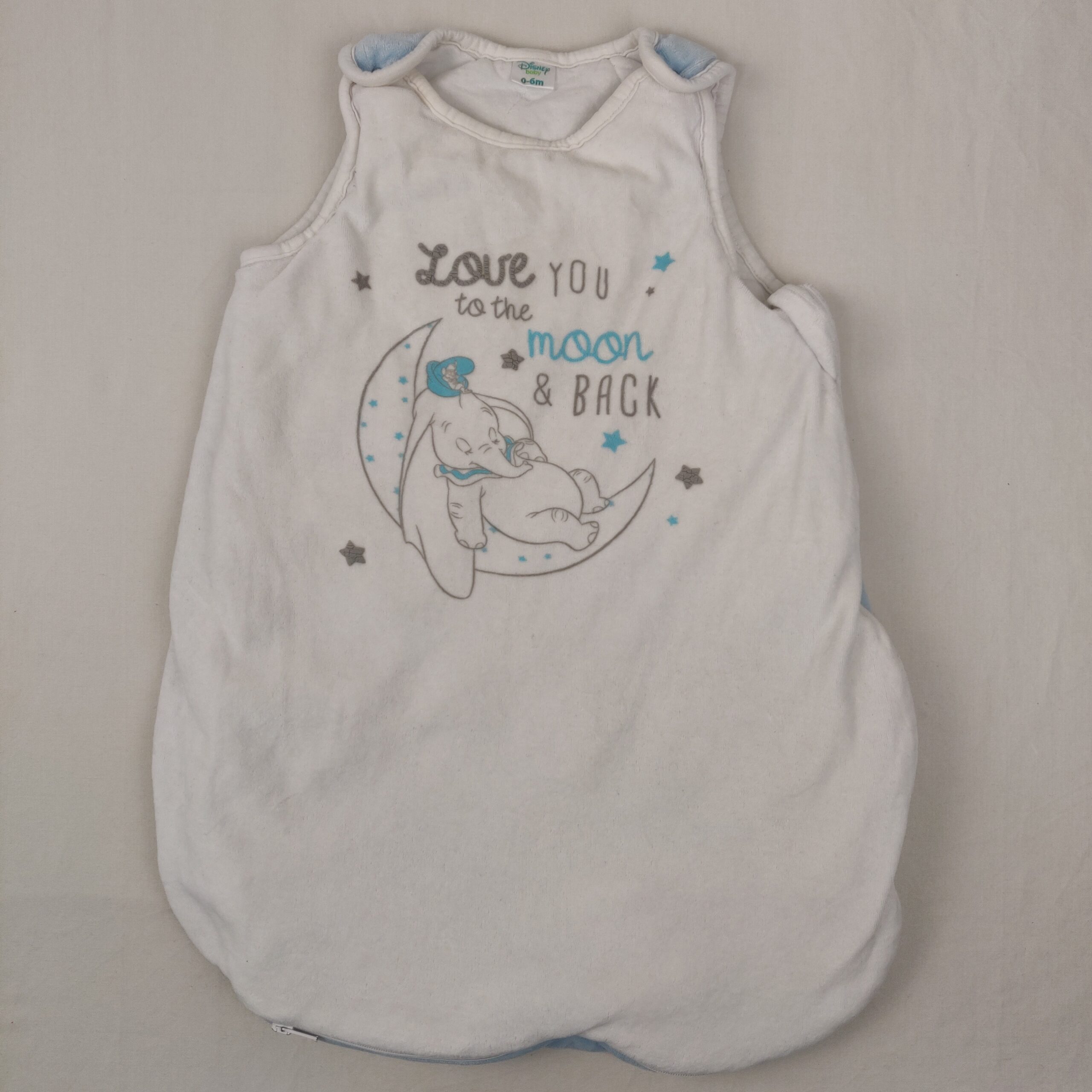 Autres commentaires : Gigoteuse Disney bicolore, composée de 80 % coton et 20 % polyester : face avant blanche avec un motif de Dumbo, dos bleu ciel.