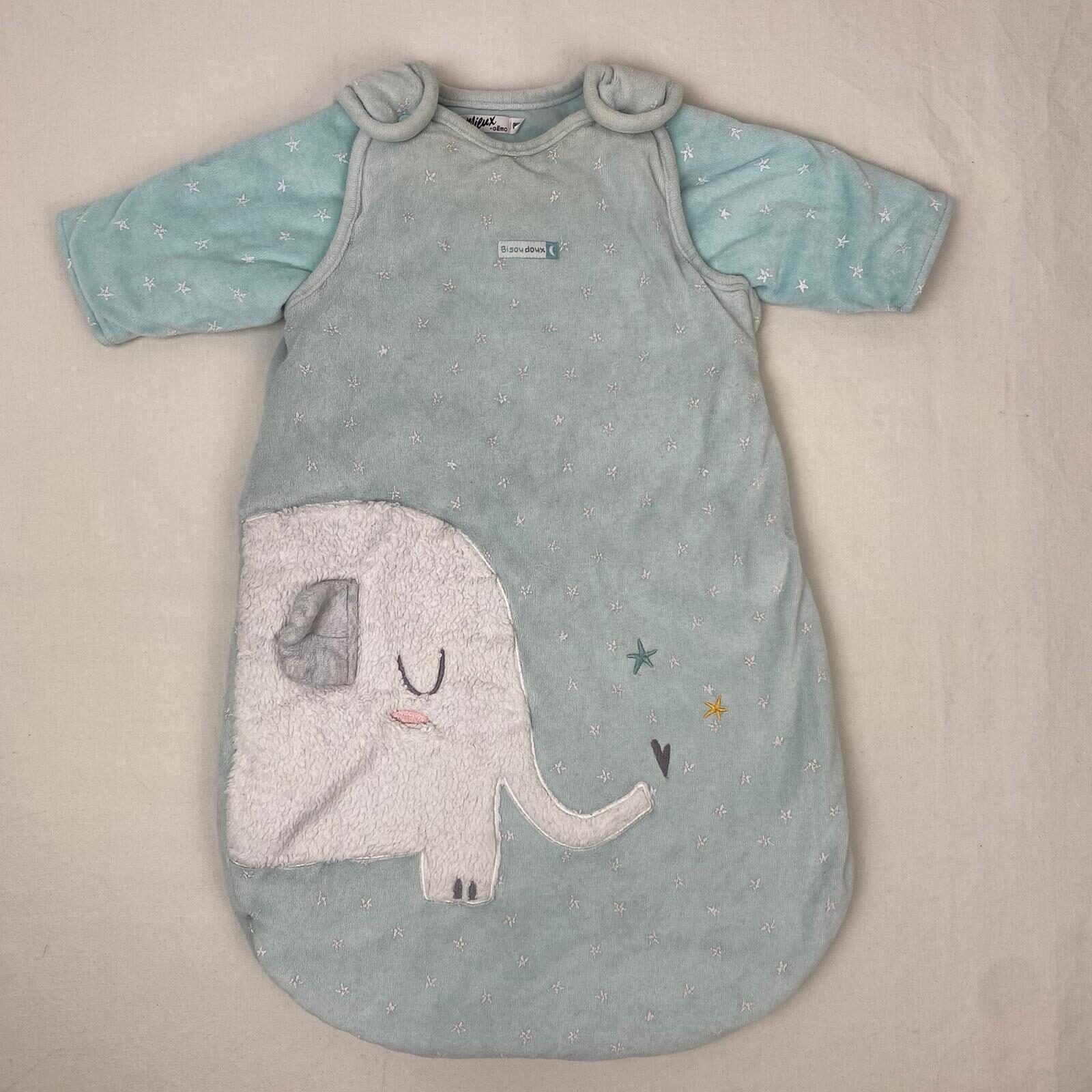 Autres commentaires : 25% polyester. Gigoteuse turquoise en velours, manches amovibles par boutons pression, motifs éléphant et étoiles, fermeture par boutons pression aux épaules et par zip sur la partie basse, doublure en coton 100%, garnissage en polyester 100%.