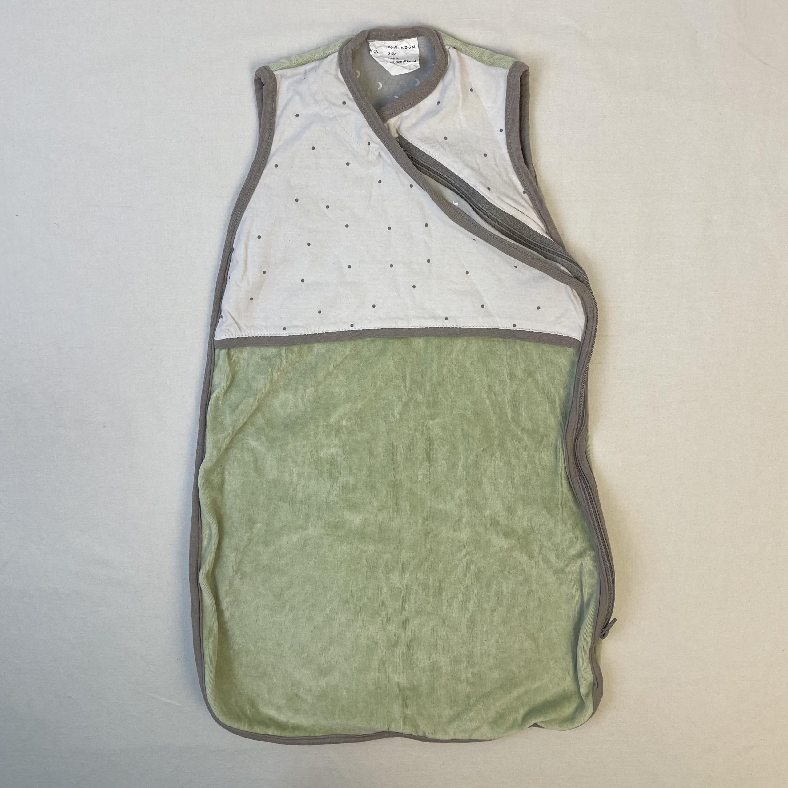 - Gigoteuse en velours sans manches, TOG 1, tissu extérieur 100% coton. Plastron blanc avec des points gris et intérieur gris avec des motifs de lune blanches .