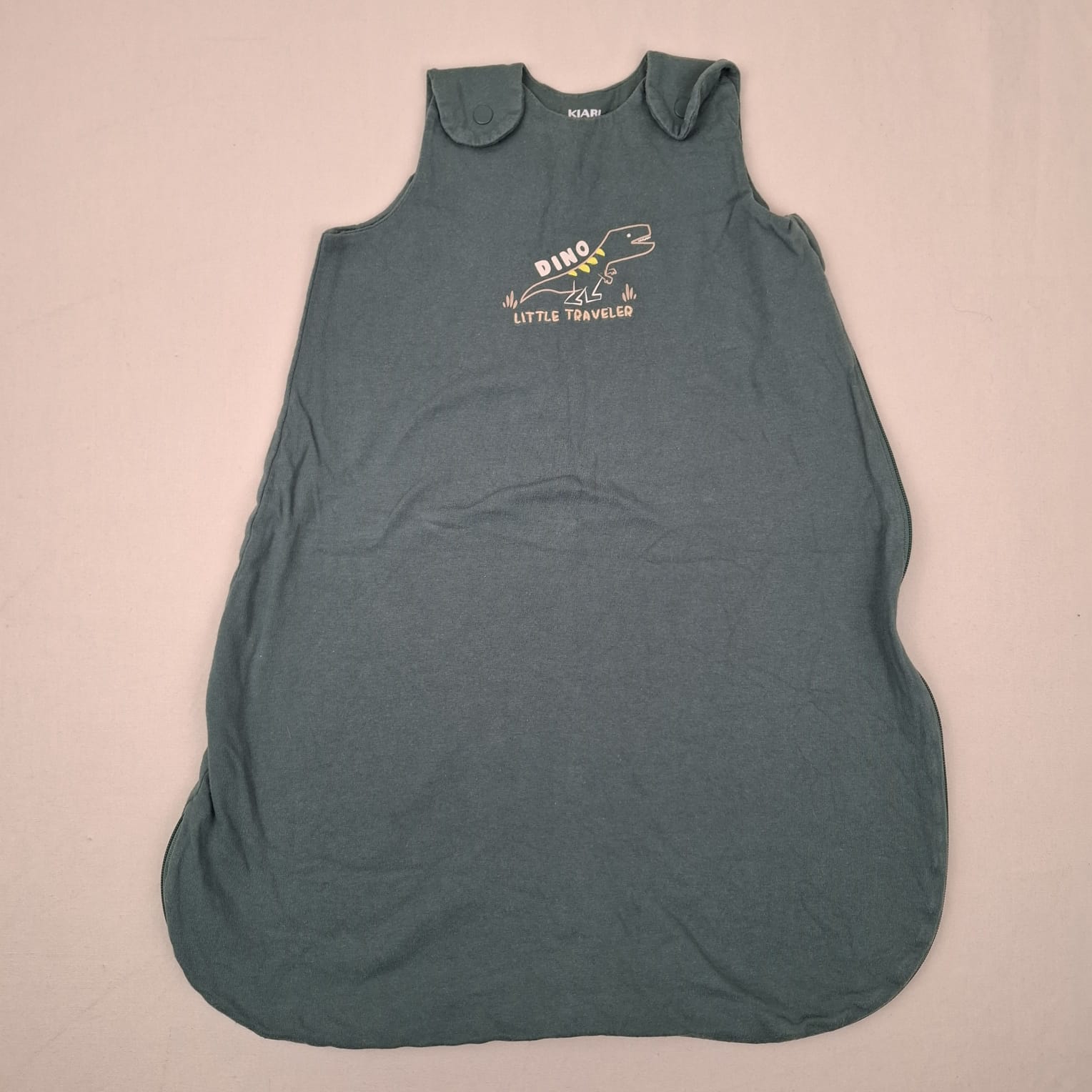 Autres commentaires : Gigoteuse légère bleu vert foncé sans manches, motif dinosaure et inscription « Dino little traveler », fermeture par boutons pression sur les épaules, fermeture éclair sur le côté gauche et à la base avec protège-zip, doublure en coton, TOG 0.5.