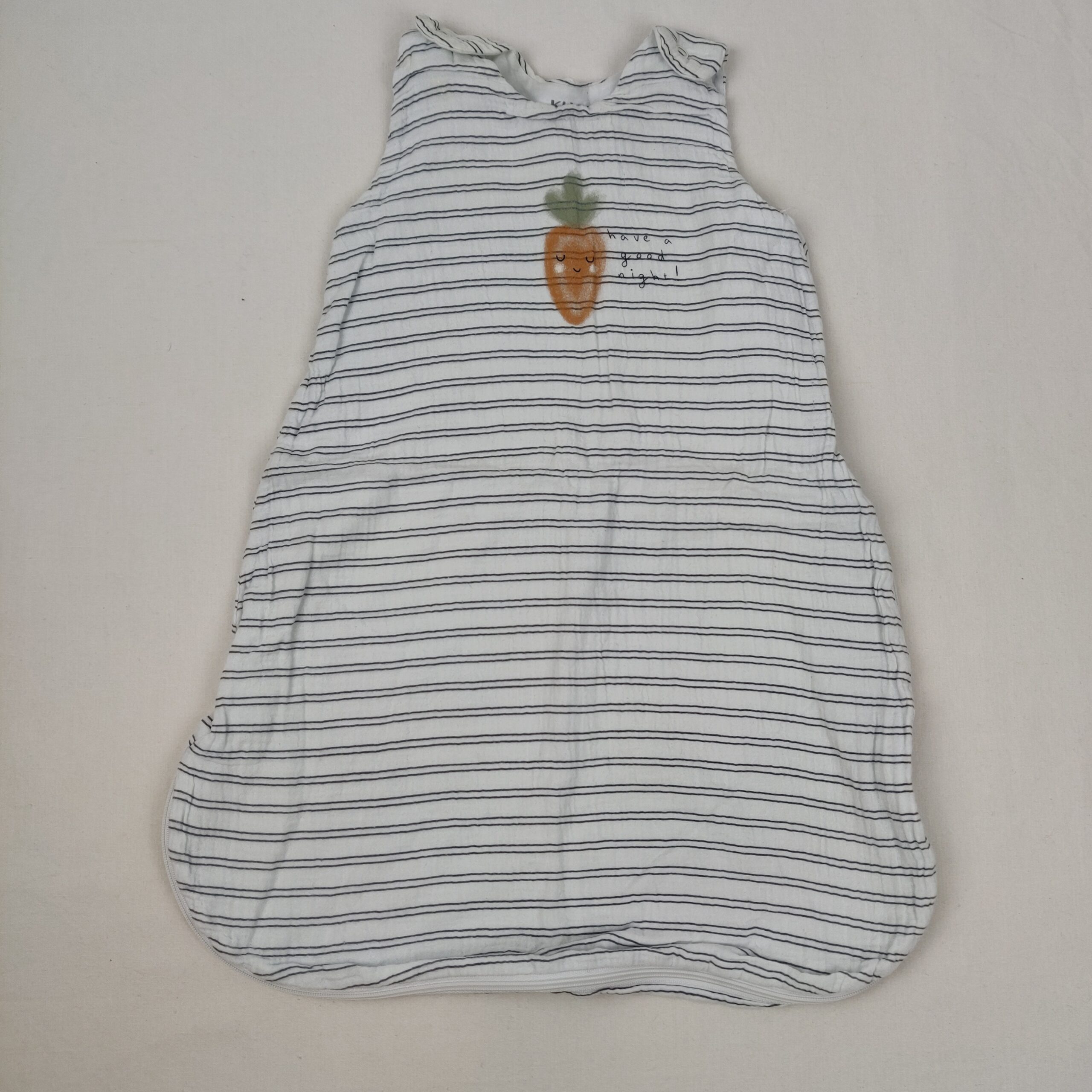 Autres commentaires : Gigoteuse 0-6M blanche rayée noire avec petit motif carotte et inscription Have a good night – Gamme Eco-conception – réglable par boutons pression – légèrement jauni sur le haut de la bretelle gauche. Niveau réduit de Fraise à Myrtille