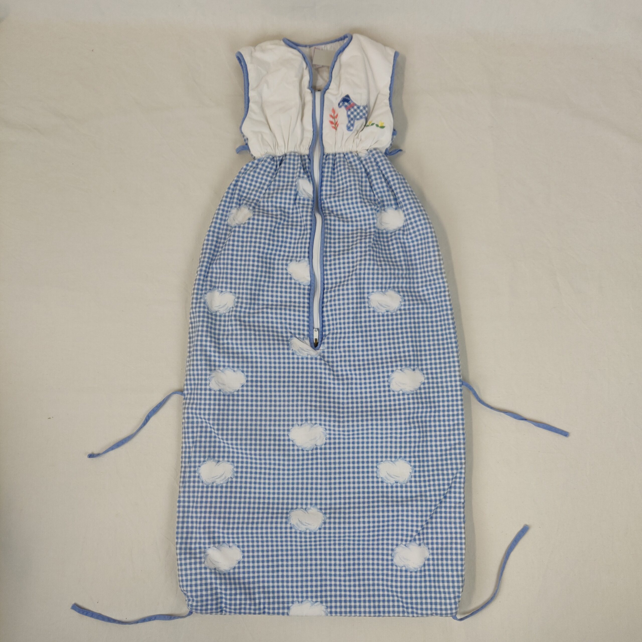 Autres commentaires : Garnissage polyester. Gigoteuse vintage à carreaux bleus et blancs, motif chien dans une prairie. Fermeture par zip central inversé (pratique pour changer bébé). Taille élastiquée, rubans pour raccourcir la gigoteuse quand bébé est petit.