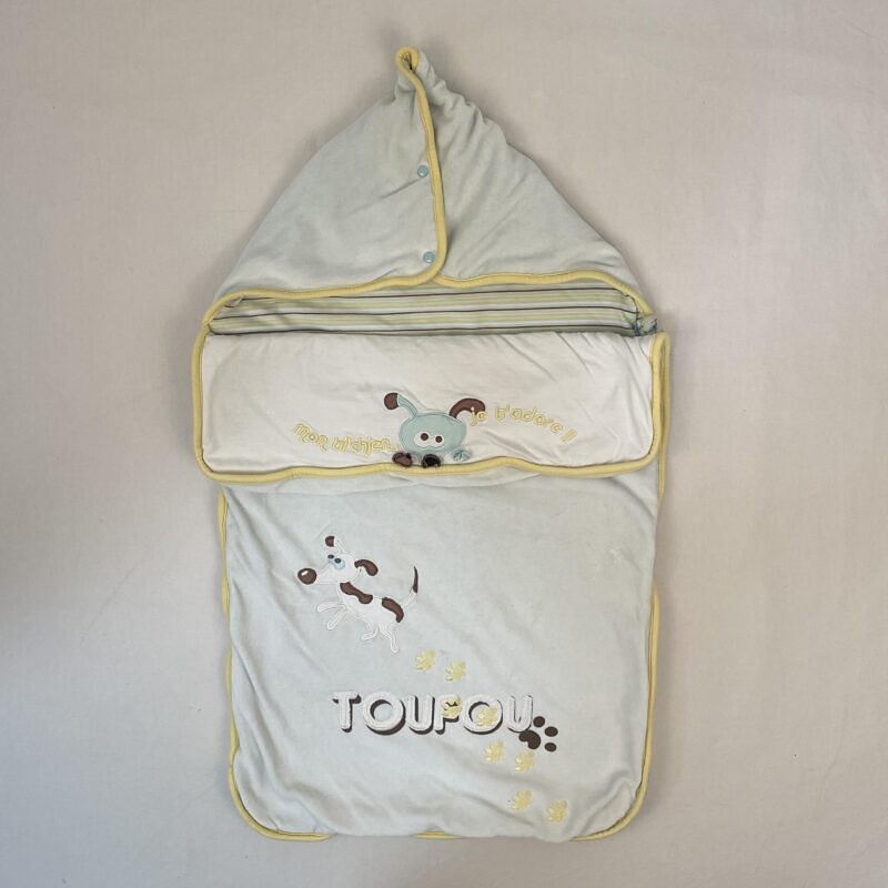 - Nid d’ange bleu pâle en velours avec doublure, fermeture par boutons pression et par zip, motif chien et inscription « Mon chien je t’adore. Toupou ».