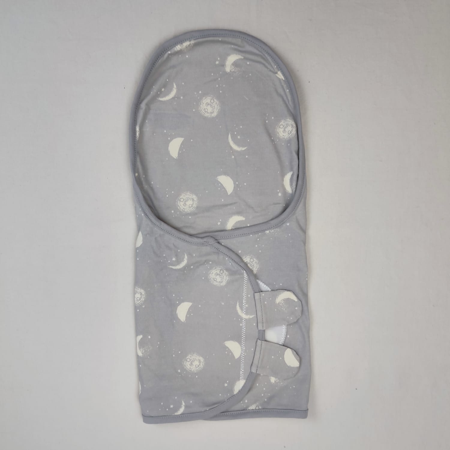 Autres commentaires : Couverture d’emmaillotage en jersey de coton, réglable par scratch, gris clair avec motifs lunes et étoiles de couleur crème, taille unique (estimée à 0-3 mois).